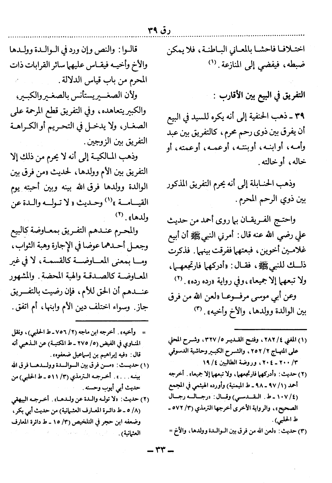 39 - ذَهَبَ الْحَنَفِيَّةُ إِلَى أَنَّهُ يُكْرَهُ لِلسَّيِّدِ فِي الْبَيْعِ أَنْ يُفَرِّقَ بَيْنَ ذَوِي رَحِمٍ مَحْرَمٍ، كَالتَّفْرِيقِ بَيْنَ عَبْدٍ وَأُمِّهِ، أَوِ ابْنِهِ، أَوْ بِنْتِهِ، أَوْ عَمِّهِ، أَوْ عَمَّتِهِ، أَوْ خَالِهِ، أَوْ خَالَتِهِ.
