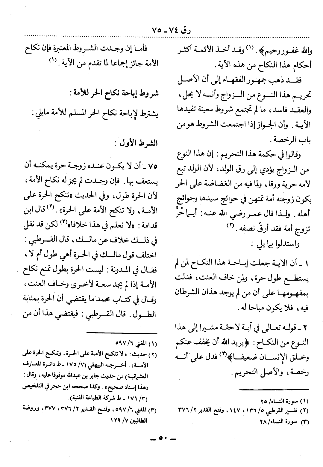 75 - أَنْ لاَ يَكُونَ عِنْدَهُ زَوْجَةٌ حُرَّةٌ يُمْكِنُهُ أَنْ يَسْتَعِفَّ بِهَا. فَإِنْ وُجِدَتْ لَمْ يَجُزْ لَهُ نِكَاحُ الأَْمَةِ؛ لأَِنَّ الْحُرَّةَ طَوْلٌ، وَفِي الْحَدِيثِ تُنْكَحُ الْحُرَّةُ عَلَى الأَْمَةِ، وَلاَ تُنْكَحُ الأَْمَةُ عَلَى الْحُرَّةِ. (2) قَال ابْنُ قُدَامَةَ: لاَ نَعْلَمُ فِي هَذَا خِلاَفًا (3) " لَكِنْ قَدْ نُقِل فِي ذَلِكَ خِلاَفٌ عَنْ مَالِكٍ، قَال الْقُرْطُبِيُّ: اخْتَلَفَ قَوْل مَالِكٍ فِي الْحُرَّةِ أَهِيَ طَوْلٌ أَمْ لاَ، فَقَال فِي الْمُدَوَّنَةِ: لَيْسَتِ الْحُرَّةُ بِطَوْلٍ تَمْنَعُ نِكَاحَ الأَْمَةِ إِذَا لَمْ يَجِدْ سَعَةً لأُِخْرَى وَخَافَ الْعَنَتَ، وَقَال فِي كِتَابِ مُحَمَّدٍ مَا يَقْتَضِي أَنَّ الْحُرَّةَ بِمَثَابَةِ الطَّوْل. قَال الْقُرْطُبِيُّ: فَيَقْتَضِي هَذَا أَنَّ مَنْ