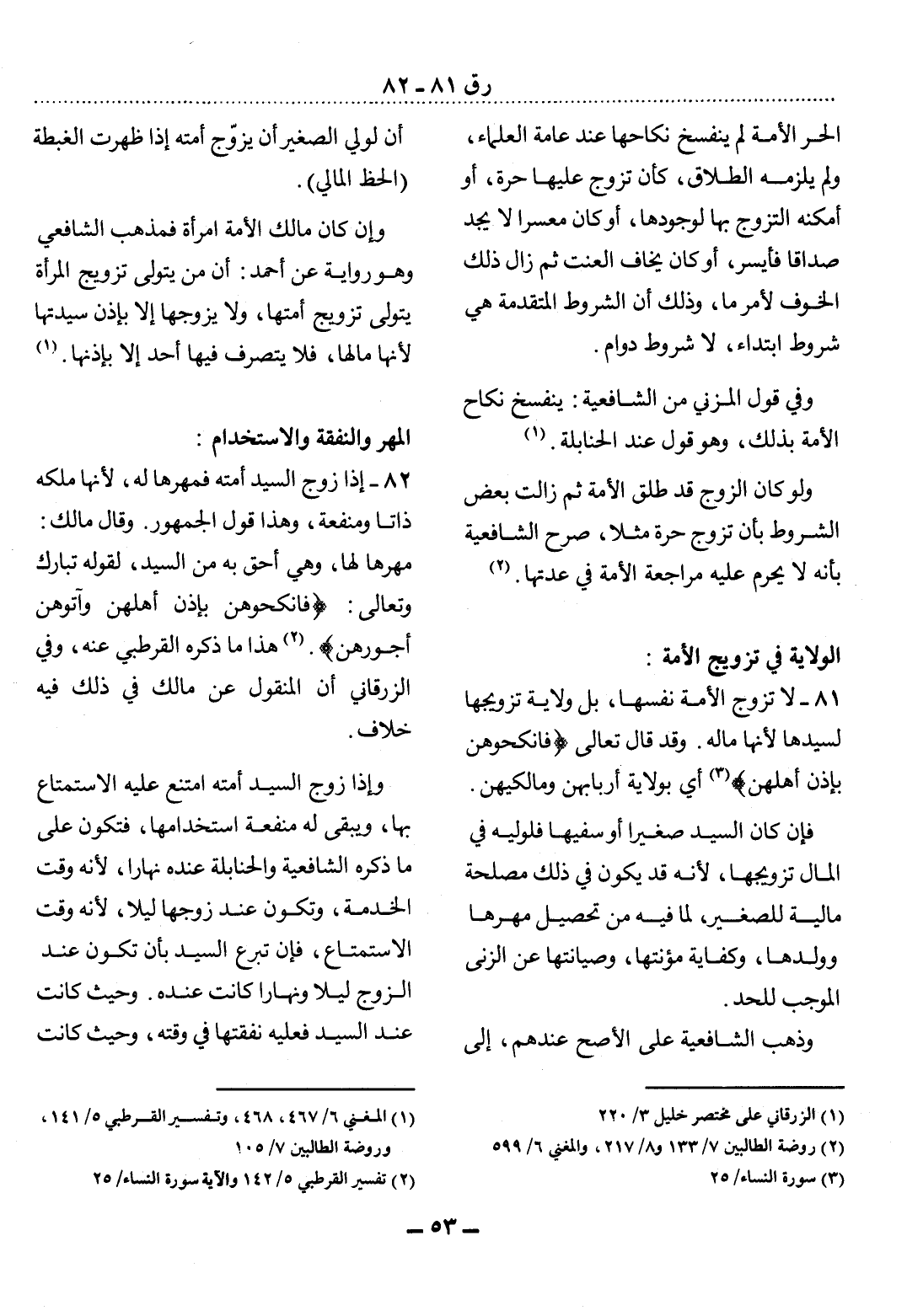 81 - لاَ تُزَوِّجُ الأَْمَةُ نَفْسَهَا، بَل وِلاَيَةُ تَزْوِيجِهَا لِسَيِّدِهَا لأَِنَّهَا مَالُهُ. وَقَدْ قَال تَعَالَى {فَانْكِحُوهُنَّ بِإِذْنِ أَهْلِهِنَّ} (3) أَيْ بِوِلاَيَةِ أَرْبَابِهِنَّ وَمَالِكِيهِنَّ.