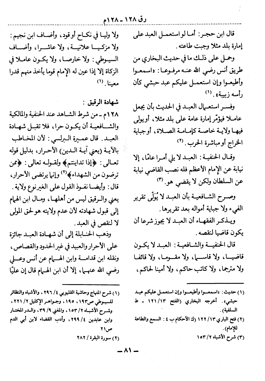 128 م - مِنْ شَرْطِ الشَّاهِدِ عِنْدَ الْحَنَفِيَّةِ وَالْمَالِكِيَّةِ وَالشَّافِعِيَّةِ أَنْ يَكُونَ حُرًّا، فَلاَ تُقْبَل شَهَادَةُ الْعَبْدِ. قَال عَمِيرَةُ الْبُرُلُّسِيُّ: لأَِنَّ الْمُخَاطَبَ بِالآْيَةِ (يَعْنِي آيَةَ الدَّيْنِ) الأَْحْرَارَ، بِدَلِيل قَوْله تَعَالَى: {إِذَا تَدَايَنْتُمْ} لِقَوْلِهِ تَعَالَى: {مِمَّنْ تَرْضَوْنَ مِنَ الشُّهَدَاءِ} (2) وَإِنَّمَا يُرْتَضَى الأَْحْرَارُ، قَال: وَأَيْضًا نُفُوذُ الْقَوْل عَلَى الْغَيْرِ نَوْعُ وِلاَيَةٍ. يَعْنِي وَالرَّقِيقُ لَيْسَ مِنْ أَهْلِهَا، وَمَال ابْنُ الْهُمَامِ إِلَى قَبُول شَهَادَتِهِ لأَِنَّ عَدَمَ وِلاَيَتِهِ هُوَ لِحَقِّ الْمَوْلَى لاَ لِنَقْصٍ فِي الْعَبْدِ.