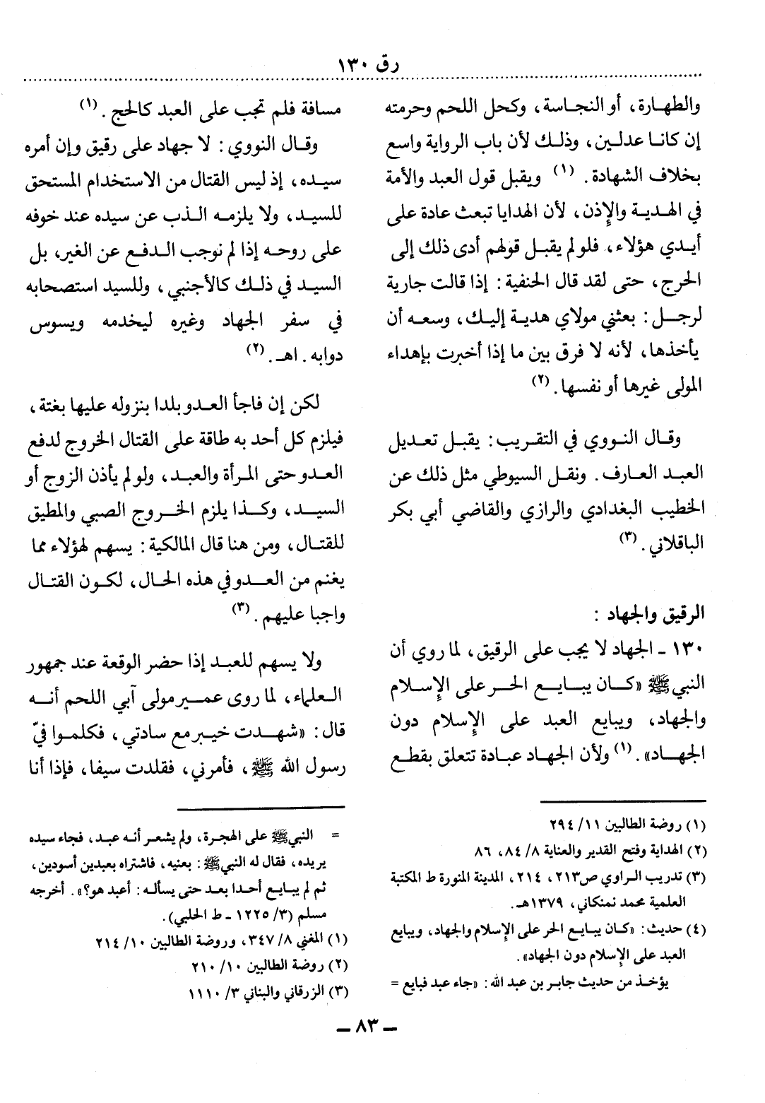 130 - الْجِهَادُ لاَ يَجِبُ عَلَى الرَّقِيقِ، لِمَا رُوِيَ أَنَّ النَّبِيَّ صَلَّى اللَّهُ عَلَيْهِ وَسَلَّمَ كَانَ يُبَايِعُ الْحُرَّ عَلَى الإِْسْلاَمِ وَالْجِهَادِ، وَيُبَايِعُ الْعَبْدَ عَلَى الإِْسْلاَمِ دُونَ الْجِهَادِ (4) . وَلأَِنَّ الْجِهَادَ عِبَادَةٌ تَتَعَلَّقُ بِقَطْعِ