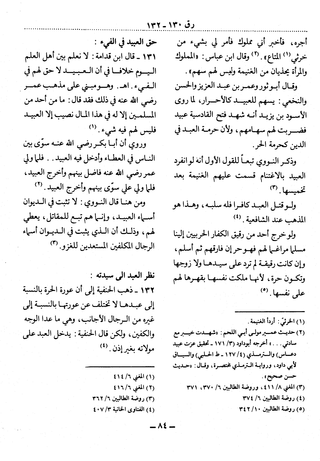 131 - قَال ابْنُ قُدَامَةَ: لاَ نَعْلَمُ بَيْنَ أَهْل الْعِلْمِ الْيَوْمَ خِلاَفًا فِي أَنَّ الْعَبِيدَ لاَ حَقَّ لَهُمْ فِي الْفَيْءِ. اهـ. وَهُوَ مَبْنِيٌّ عَلَى مَذْهَبِ عُمَرَ رَضِيَ اللَّهُ عَنْهُ فِي ذَلِكَ فَقَدْ قَال: مَا مِنْ أَحَدٍ مِنَ الْمُسْلِمِينَ إِلاَّ لَهُ فِي هَذَا الْمَال نَصِيبٌ إِلاَّ الْعَبِيدَ فَلَيْسَ لَهُمْ فِيهِ شَيْءٌ (1) .