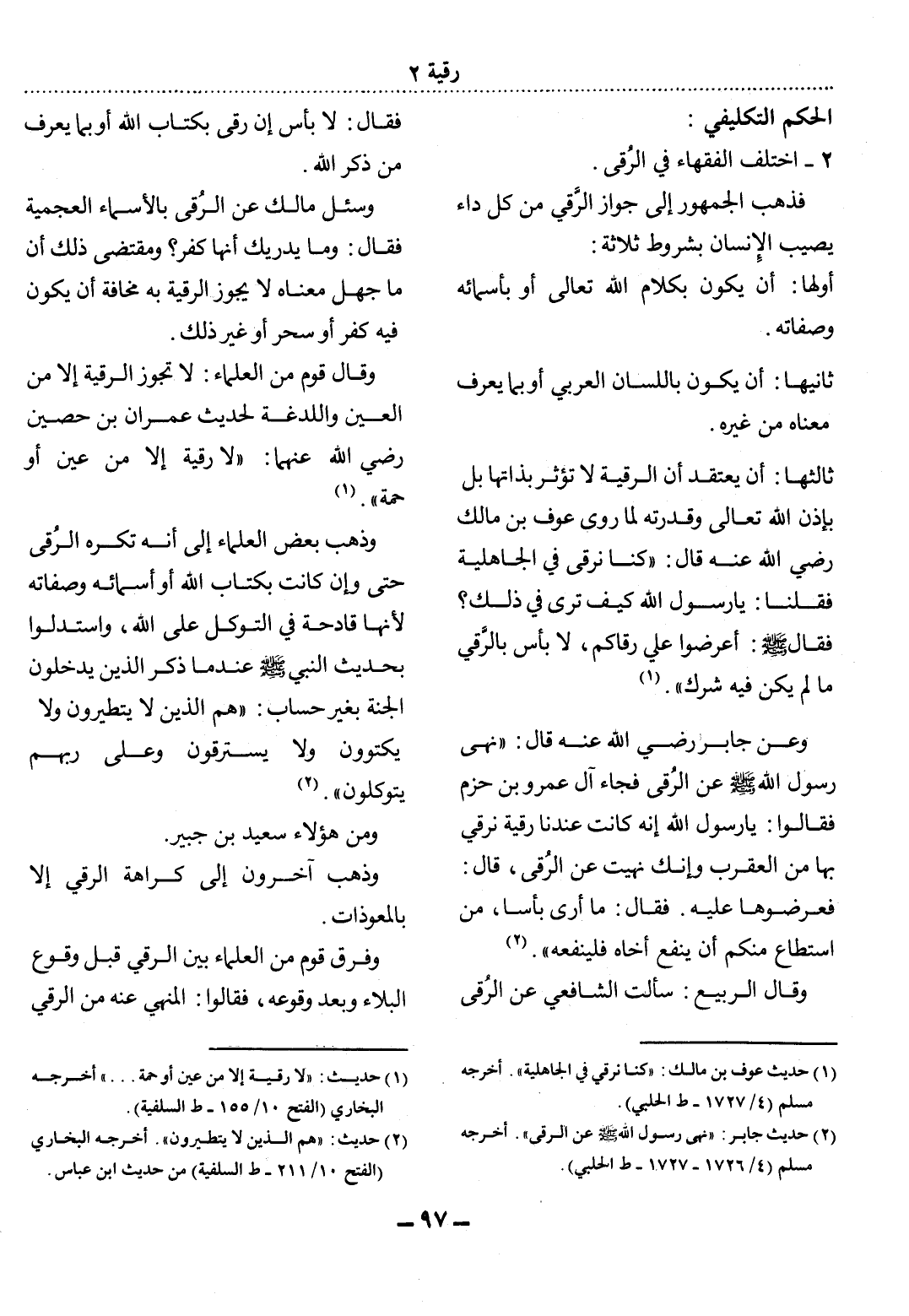 (1) حديث عوف بن مالك: " كنا نرقي في الجاهلية ". أخرجه مسلم (4 / 1727 - ط الحلبي) .