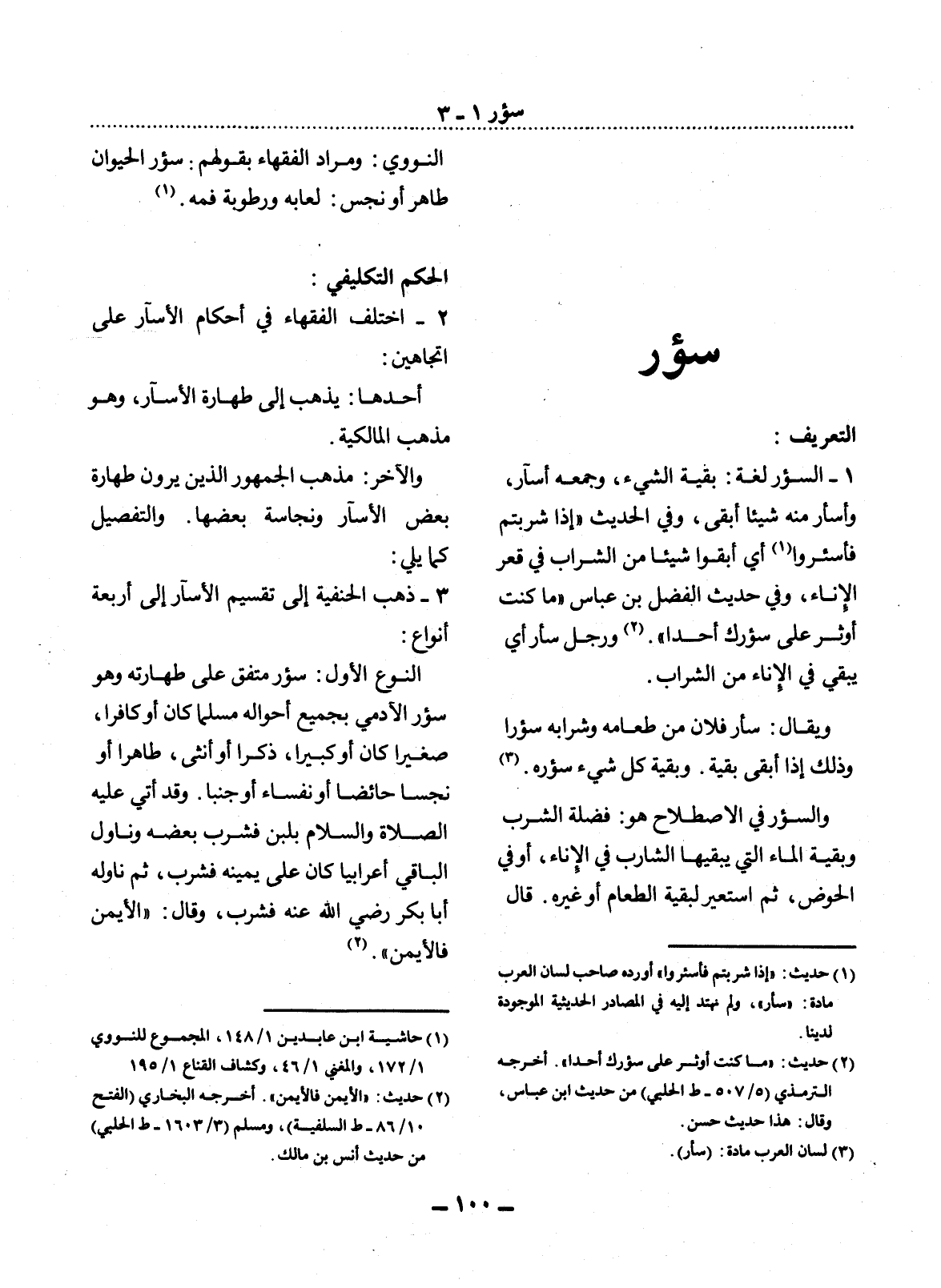 (1) حديث: " إذا شربتم فأسئروا " أورده صاحب لسان العرب مادة: " سأر "، ولم نهتد إليه في المصادر الحديثية الموجودة لدينا.
