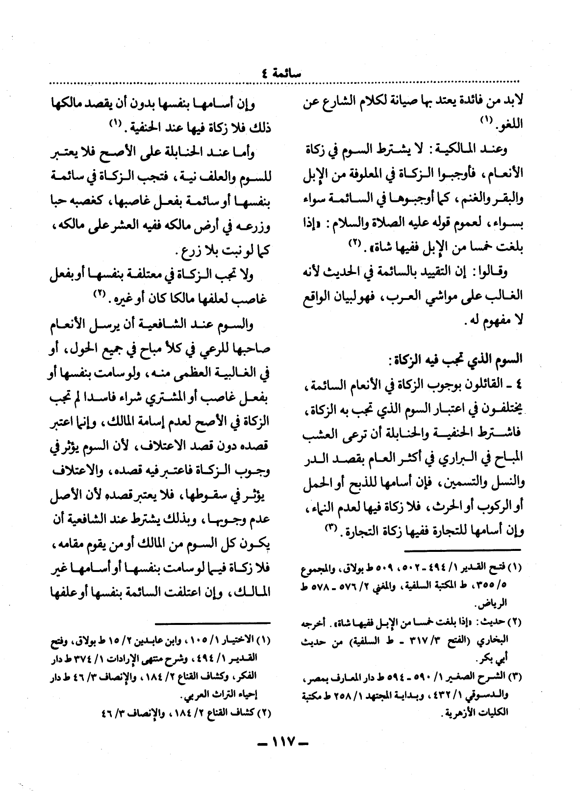 4 - الْقَائِلُونَ بِوُجُوبِ الزَّكَاةِ فِي الأَْنْعَامِ السَّائِمَةِ، يَخْتَلِفُونَ فِي اعْتِبَارِ السَّوْمِ الَّذِي تَجِبُ بِهِ الزَّكَاةُ، فَاشْتَرَطَ الْحَنَفِيَّةُ وَالْحَنَابِلَةُ أَنْ تَرْعَى الْعُشْبَ الْمُبَاحَ فِي الْبَرَارِيِ فِي أَكْثَرِ الْعَامِ بِقَصْدِ الدَّرِّ وَالنَّسْل وَالتَّسْمِينِ، فَإِنْ أَسَامَهَا لِلذَّبْحِ أَوِ الْحَمْل أَوِ الرُّكُوبِ أَوِ الْحَرْثِ، فَلاَ زَكَاةَ فِيهَا لِعَدَمِ النَّمَاءِ، وَإِنْ أَسَامَهَا لِلتِّجَارَةِ فَفِيهَا زَكَاةُ التِّجَارَةِ (3) .