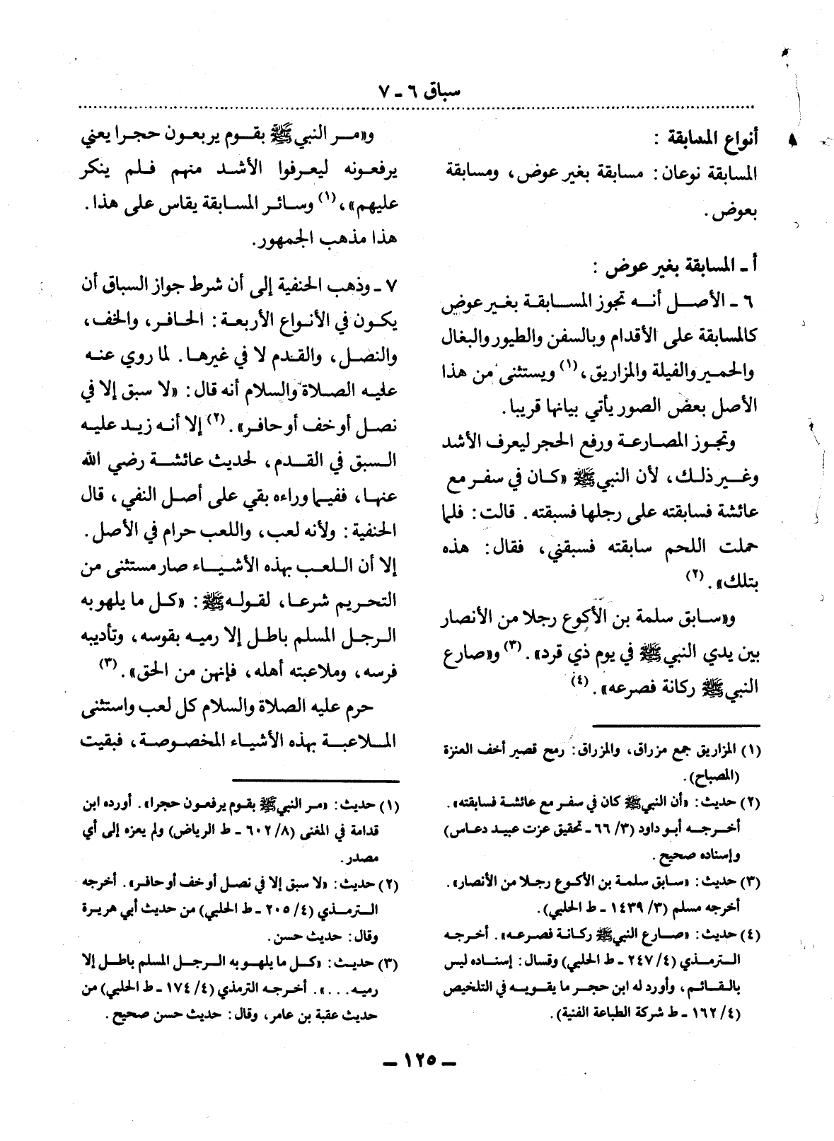 (2) حديث: " لا سبق إلا في نصل أو خف أو حافر ". أخرجه الترمذي (4 / 205 - ط الحلبي) من حديث أبي هريرة وقال: حديث حسن.