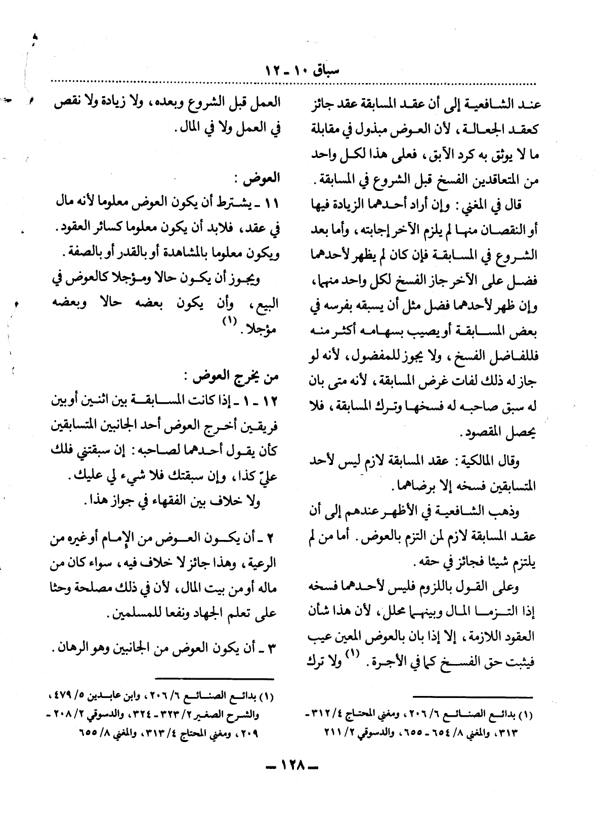 11 - يُشْتَرَطُ أَنْ يَكُونَ الْعِوَضُ مَعْلُومًا لأَِنَّهُ مَالٌ فِي عَقْدٍ، فَلاَ بُدَّ أَنْ يَكُونَ مَعْلُومًا كَسَائِرِ الْعُقُودِ. وَيَكُونُ مَعْلُومًا بِالْمُشَاهَدَةِ أَوْ بِالْقَدْرِ أَوْ بِالصِّفَةِ.