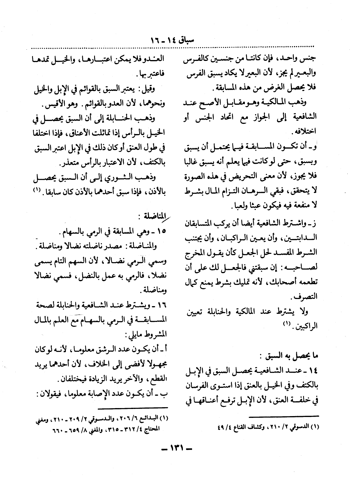 و أَنْ تَكُونَ الْمُسَابَقَةُ فِيمَا يُحْتَمَل أَنْ يَسْبِقَ وَيُسْبَقَ، حَتَّى لَوْ كَانَتْ فِيمَا يَعْلَمُ أَنَّهُ يَسْبِقُ غَالِبًا فَلاَ يَجُوزُ؛ لأَِنَّ مَعْنَى التَّحْرِيضِ فِي هَذِهِ الصُّورَةِ لاَ يَتَحَقَّقُ، فَبَقِيَ الرِّهَانُ الْتِزَامُ الْمَال بِشَرْطٍ لاَ مَنْفَعَةَ فِيهِ فَيَكُونُ عَبَثًا وَلَعِبًا.