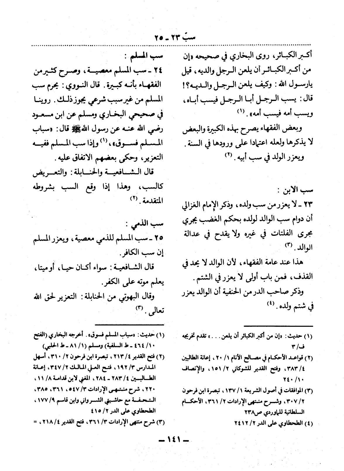 25 - سَبُّ الْمُسْلِمِ لِلذِّمِّيِّ مَعْصِيَةٌ، وَيُعَزَّرُ الْمُسْلِمُ إِنْ سَبَّ الْكَافِرَ.
