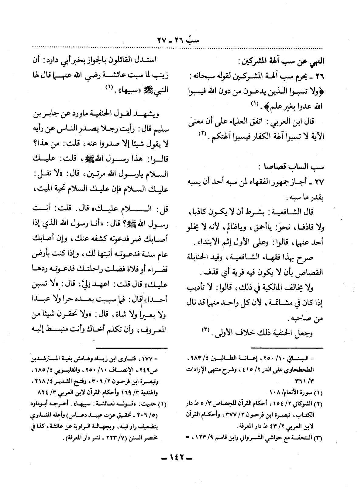 26 - يَحْرُمُ سَبُّ آلِهَةِ الْمُشْرِكِينَ لِقَوْلِهِ سُبْحَانَهُ: {وَلاَ تَسُبُّوا الَّذِينَ يَدْعُونَ مِنْ دُونِ اللَّهِ فَيَسُبُّوا اللَّهَ عَدْوًا بِغَيْرِ عِلْمٍ} . (1)