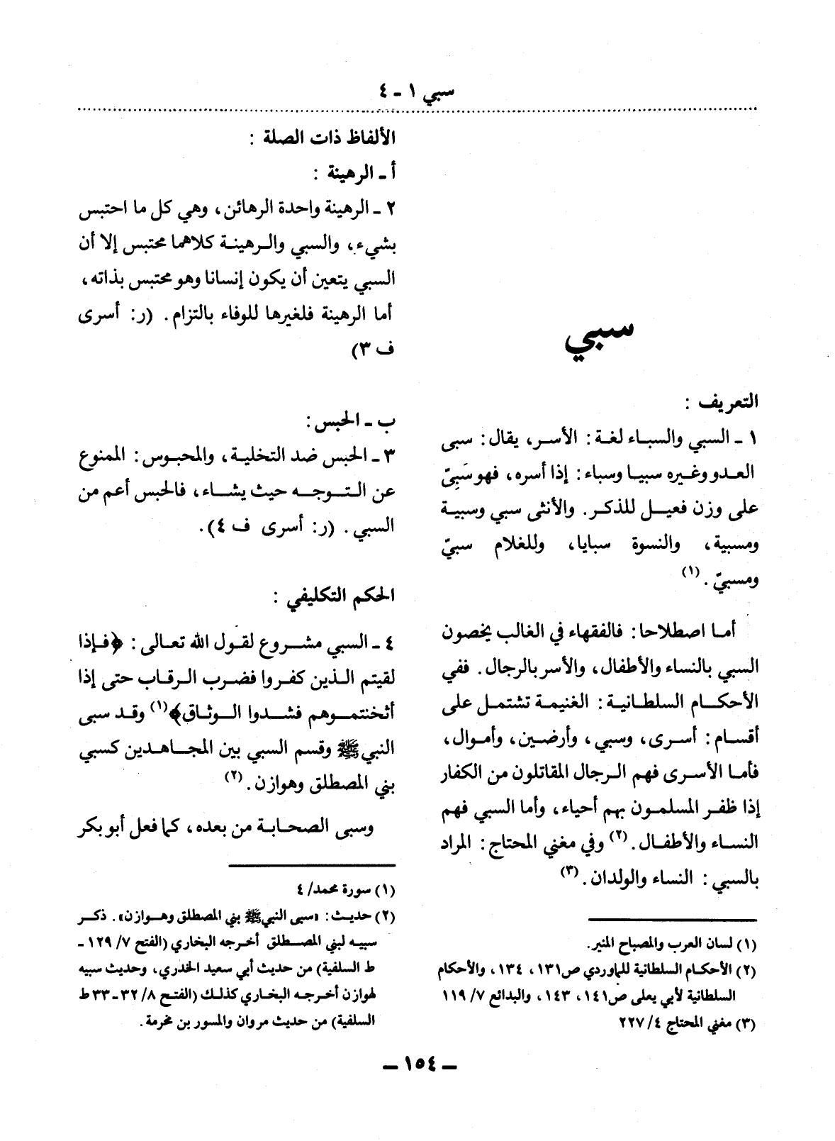 4 - السَّبْيُ مَشْرُوعٌ لِقَوْل اللَّهِ تَعَالَى: {فَإِذَا لَقِيتُمُ الَّذِينَ كَفَرُوا فَضَرْبَ الرِّقَابِ حَتَّى إِذَا أَثْخَنْتُمُوهُمْ فَشُدُّوا الْوَثَاقَ} (1) وَقَدْ سَبَى النَّبِيُّ صَلَّى اللَّهُ عَلَيْهِ وَسَلَّمَ وَقَسَّمَ السَّبْيَ بَيْنَ الْمُجَاهِدِينَ كَسْبِي بَنِي الْمُصْطَلِقِ وَهَوَازِنَ (2) . وَسَبَى الصَّحَابَةُ مِنْ بَعْدِهِ، كَمَا فَعَل أَبُو بَكْرٍ