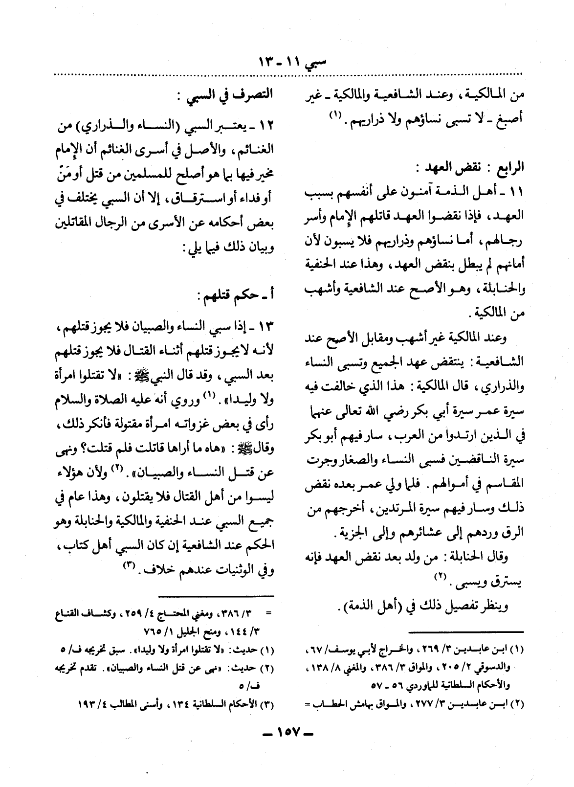 13 - إِذَا سُبِيَ النِّسَاءُ وَالصِّبْيَانُ فَلاَ يَجُوزُ قَتْلُهُمْ؛ لأَِنَّهُ لاَ يَجُوزُ قَتْلُهُمْ أَثْنَاءَ الْقِتَال فَلاَ يَجُوزُ قَتْلُهُمْ بَعْدَ السَّبْيِ، وَقَدْ قَال النَّبِيُّ صَلَّى اللَّهُ عَلَيْهِ وَسَلَّمَ: لاَ تَقْتُلُوا امْرَأَةً وَلاَ وَلِيدًا. (1) وَرُوِيَ أَنَّهُ عَلَيْهِ الصَّلَاةُ وَالسَّلَامُ رَأَى فِي بَعْضِ غَزَوَاتِهِ امْرَأَةً مَقْتُولَةً فَأَنْكَرَ ذَلِكَ، وَقَال صَلَّى اللَّهُ عَلَيْهِ وَسَلَّمَ: هَاهْ مَا أَرَاهَا قَاتَلَتْ فَلِمَ قُتِلَتْ؟ وَنَهَى عَنْ قَتْل النِّسَاءِ وَالصِّبْيَانِ. (2) وَلأَِنَّ هَؤُلاَءِ لَيْسُوا مِنْ أَهْل الْقِتَال فَلاَ يُقْتَلُونَ، وَهَذَا عَامٌّ فِي جَمِيعِ السَّبْيِ عِنْدَ الْحَنَفِيَّةِ وَالْمَالِكِيَّةِ وَالْحَنَابِلَةِ وَهُوَ الْحُكْمُ عِنْدَ الشَّافِعِيَّةِ إِنْ كَانَ السَّبْيُ أَهْل كِتَابٍ، وَفِي الْوَثَنِيَّاتِ عِنْدَهُمْ خِلاَفٌ. (3)