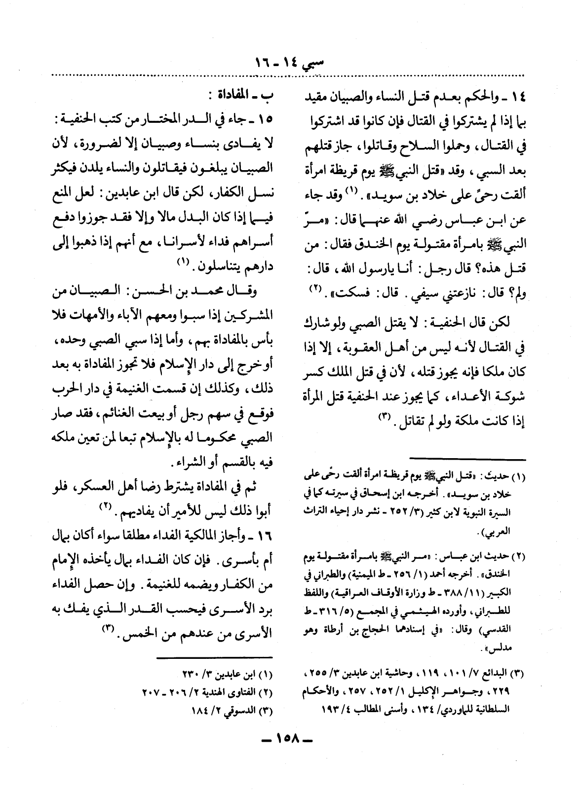15 - جَاءَ فِي الدُّرِّ الْمُخْتَارِ مِنْ كُتُبِ الْحَنَفِيَّةِ: لاَ يُفَادَى بِنِسَاءٍ وَصِبْيَانٍ إِلاَّ لِضَرُورَةٍ؛ لأَِنَّ الصِّبْيَانَ يَبْلُغُونَ فَيُقَاتِلُونَ وَالنِّسَاءُ يَلِدْنَ فَيَكْثُرُ نَسْل الْكُفَّارِ، لَكِنْ قَال ابْنُ عَابِدِينَ: لَعَل الْمَنْعَ فِيمَا إِذَا كَانَ الْبَدَل مَالاً وَإِلاَّ فَقَدْ جَوَّزُوا دَفْعَ أَسْرَاهُمْ فِدَاءً لأَِسْرَانَا، مَعَ أَنَّهُمْ إِذَا ذَهَبُوا إِلَى دَارِهِمْ يَتَنَاسَلُونَ. (1)