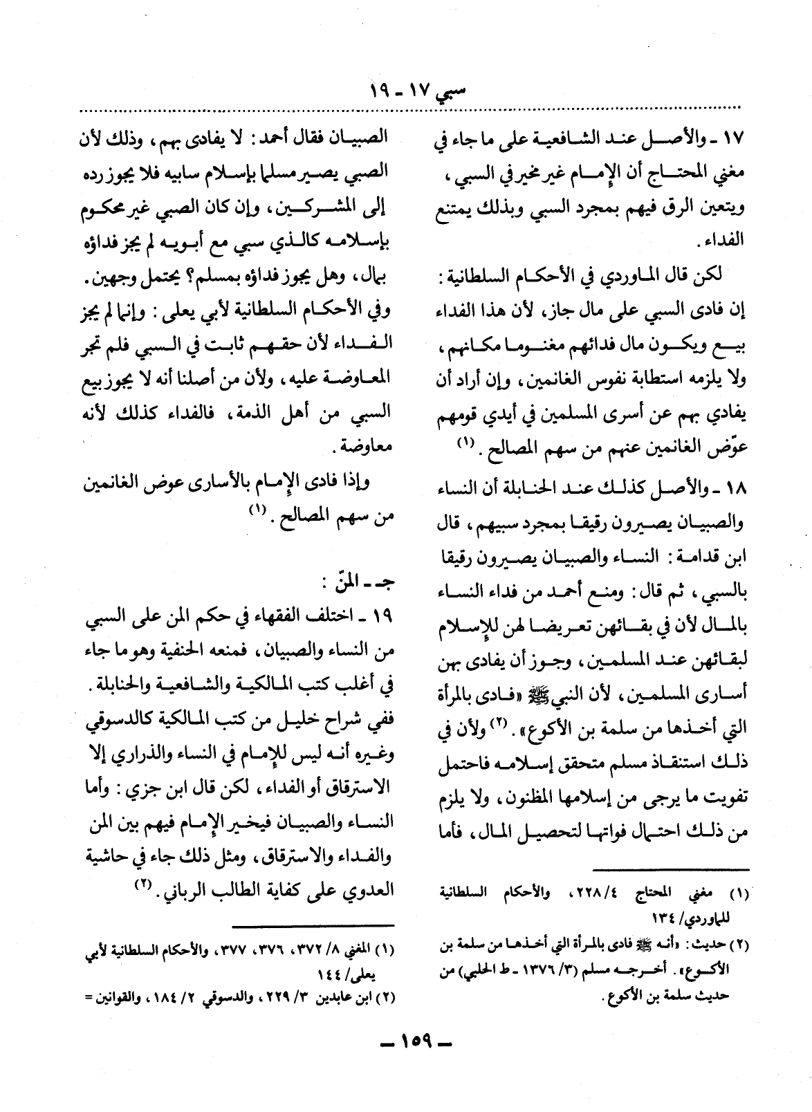 19 - اخْتَلَفَ الْفُقَهَاءُ فِي حُكْمِ الْمَنِّ عَلَى السَّبْيِ مِنَ النِّسَاءِ وَالصِّبْيَانِ، فَمَنَعَهُ الْحَنَفِيَّةُ وَهُوَ مَا جَاءَ فِي أَغْلَبِ كُتُبِ الْمَالِكِيَّةِ وَالشَّافِعِيَّةِ وَالْحَنَابِلَةِ. فَفِي شُرَّاحِ خَلِيلٍ مِنْ كُتُبِ الْمَالِكِيَّةِ كَالدُّسُوقِيِّ وَغَيْرِهِ أَنَّهُ لَيْسَ لِلإِْمَامِ فِي النِّسَاءِ وَالذَّرَارِيِّ إِلاَّ الاِسْتِرْقَاقُ أَوِ الْفِدَاءُ، لَكِنْ قَال ابْنُ جُزَيٍّ: وَأَمَّا النِّسَاءُ وَالصِّبْيَانُ فَيُخَيَّرُ الإِْمَامُ فِيهِمْ بَيْنَ الْمَنِّ وَالْفِدَاءِ وَالاِسْتِرْقَاقِ، وَمِثْل ذَلِكَ جَاءَ فِي حَاشِيَةِ الْعَدَوِيِّ عَلَى كِفَايَةِ الطَّالِبِ الرَّبَّانِيِّ. (2)