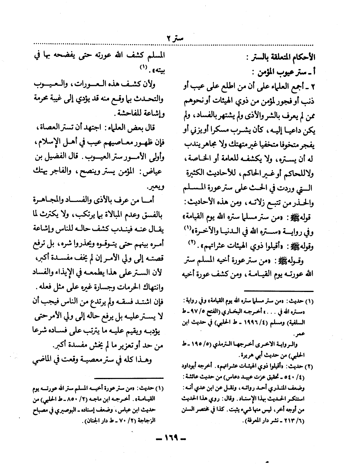 2 - أَجْمَعَ الْعُلَمَاءُ عَلَى أَنَّ مَنِ اطَّلَعَ عَلَى عَيْبٍ أَوْ ذَنْبٍ أَوْ فُجُورٍ لِمُؤْمِنٍ مِنْ ذَوِي الْهَيْئَاتِ أَوْ نَحْوِهِمْ مِمَّنْ لَمْ يُعْرَفْ بِالشَّرِّ وَالأَْذَى وَلَمْ يُشْتَهَرْ بِالْفَسَادِ، وَلَمْ يَكُنْ دَاعِيًا إِلَيْهِ، كَأَنْ يَشْرَبَ مُسْكِرًا أَوْ يَزْنِيَ أَوْ يَفْجُرَ مُتَخَوِّفًا مُتَخَفِّيًا غَيْرَ مُتَهَتِّكٍ وَلاَ مُجَاهِرٍ يُنْدَبُ لَهُ أَنْ يَسْتُرَهُ، وَلاَ يَكْشِفَهُ لِلْعَامَّةِ أَوِ الْخَاصَّةِ، وَلاَ لِلْحَاكِمِ أَوْ غَيْرِ الْحَاكِمِ، لِلأَْحَادِيثِ الْكَثِيرَةِ الَّتِي وَرَدَتْ فِي الْحَثِّ عَلَى سَتْرِ عَوْرَةِ الْمُسْلِمِ وَالْحَذَرِ مِنْ تَتَبُّعِ زَلاَّتِهِ، وَمِنْ هَذِهِ الأَْحَادِيثِ: قَوْلُهُ صَلَّى اللَّهُ عَلَيْهِ وَسَلَّمَ: مَنْ سَتَرَ مُسْلِمًا سَتَرَهُ اللَّهُ يَوْمَ الْقِيَامَةِ وَفِي رِوَايَةٍ سَتَرَهُ اللَّهُ فِي الدُّنْيَا وَالآْخِرَةِ (1) " وَقَوْلُهُ صَلَّى اللَّهُ عَلَيْهِ وَسَلَّمَ: أَقِيلُوا ذَوِي الْهَيْئَاتِ عَثَرَاتِهِمْ. (2)