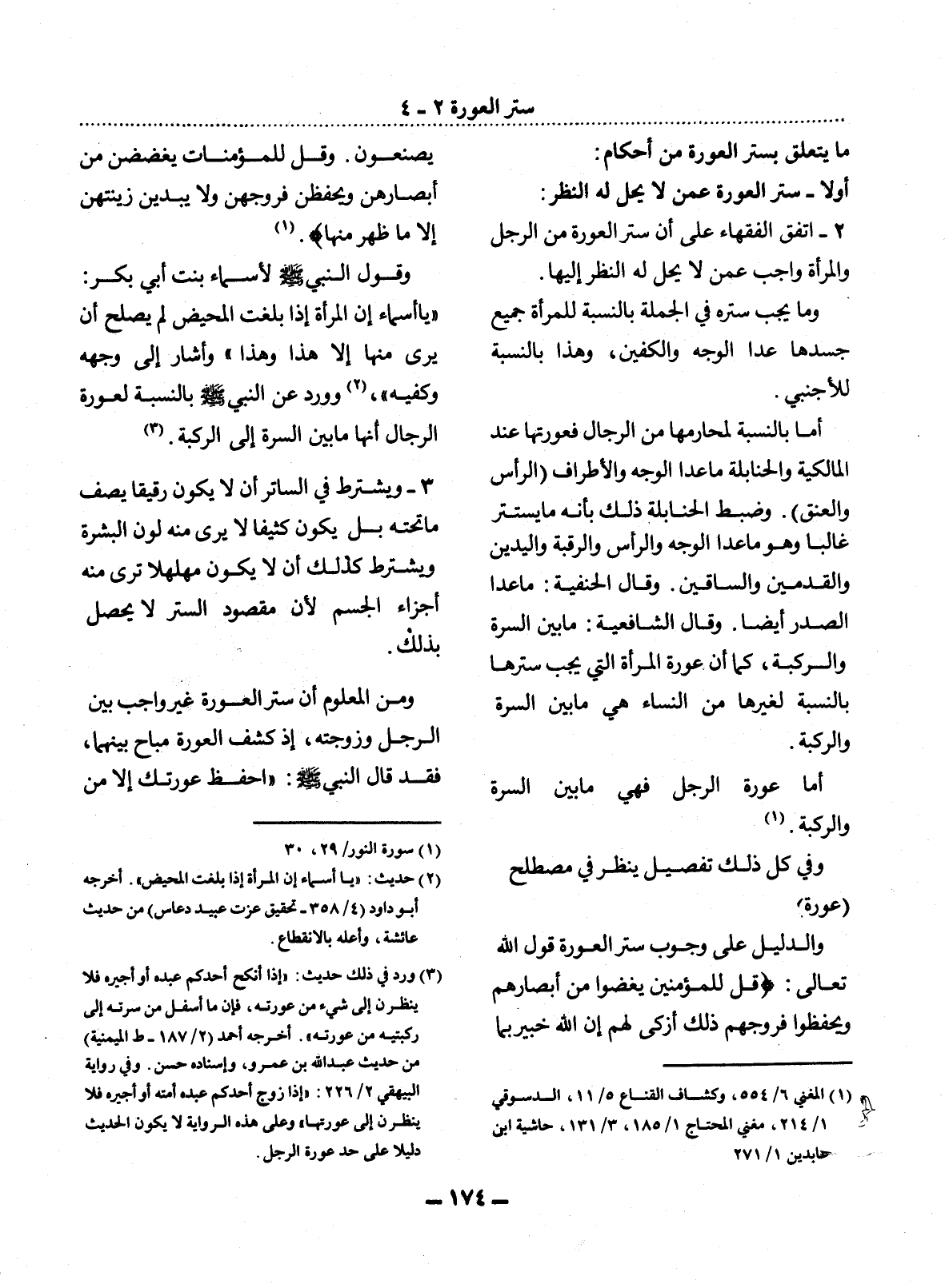 وَقَوْل النَّبِيِّ صَلَّى اللَّهُ عَلَيْهِ وَسَلَّمَ لأََسْمَاءَ بِنْتِ أَبِي بَكْرٍ: يَا أَسْمَاءُ إِنَّ الْمَرْأَةَ إِذَا بَلَغَتِ الْمَحِيضَ لَمْ يَصْلُحْ أَنْ يُرَى مِنْهَا إِلاَّ هَذَا وَهَذَا وَأَشَارَ إِلَى وَجْهِهِ وَكَفَّيْهِ (2) ، وَوَرَدَ عَنِ النَّبِيِّ صَلَّى اللَّهُ عَلَيْهِ وَسَلَّمَ بِالنِّسْبَةِ لِعَوْرَةِ الرِّجَال أَنَّهَا مَا بَيْنَ السُّرَّةِ إِلَى الرُّكْبَةِ (3) .