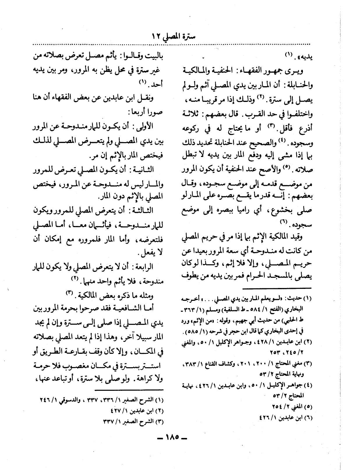 وَيَرَى جُمْهُورُ الْفُقَهَاءِ: الْحَنَفِيَّةُ وَالْمَالِكِيَّةُ وَالْحَنَابِلَةُ: أَنَّ الْمَارَّ بَيْنَ يَدَيِ الْمُصَلِّي آثِمٌ وَلَوْ لَمْ يُصَل إِلَى سُتْرَةٍ (2) . وَذَلِكَ إِذَا مَرَّ قَرِيبًا مِنْهُ، وَاخْتَلَفُوا فِي حَدِّ الْقُرْبِ. قَال بَعْضُهُمْ: ثَلاَثَةُ أَذْرُعٍ فَأَقَل (3) . أَوْ مَا يَحْتَاجُ لَهُ فِي رُكُوعِهِ وَسُجُودِهِ (4) . وَالصَّحِيحُ عِنْدَ الْحَنَابِلَةِ تَحْدِيدُ ذَلِكَ بِمَا إِذَا مَشَى إِلَيْهِ، وَدَفْعُ الْمَارِّ بَيْنَ يَدَيْهِ لاَ تُبْطِل صَلاَتَهِ (5) . وَالأَْصَحُّ عِنْدَ الْحَنَفِيَّةِ أَنْ يَكُونَ الْمُرُورُ مِنْ مَوْضِعِ قَدَمِهِ إِلَى مَوْضِعِ سُجُودِهِ، وَقَال بَعْضُهُمْ: إِنَّهُ قَدْرُ مَا يَقَعُ بَصَرُهُ عَلَى الْمَارِّ لَوْ صَلَّى بِخُشُوعٍ، أَيْ رَامِيًا بِبَصَرِهِ إِلَى مَوْضِعِ سُجُودِهِ (6) .