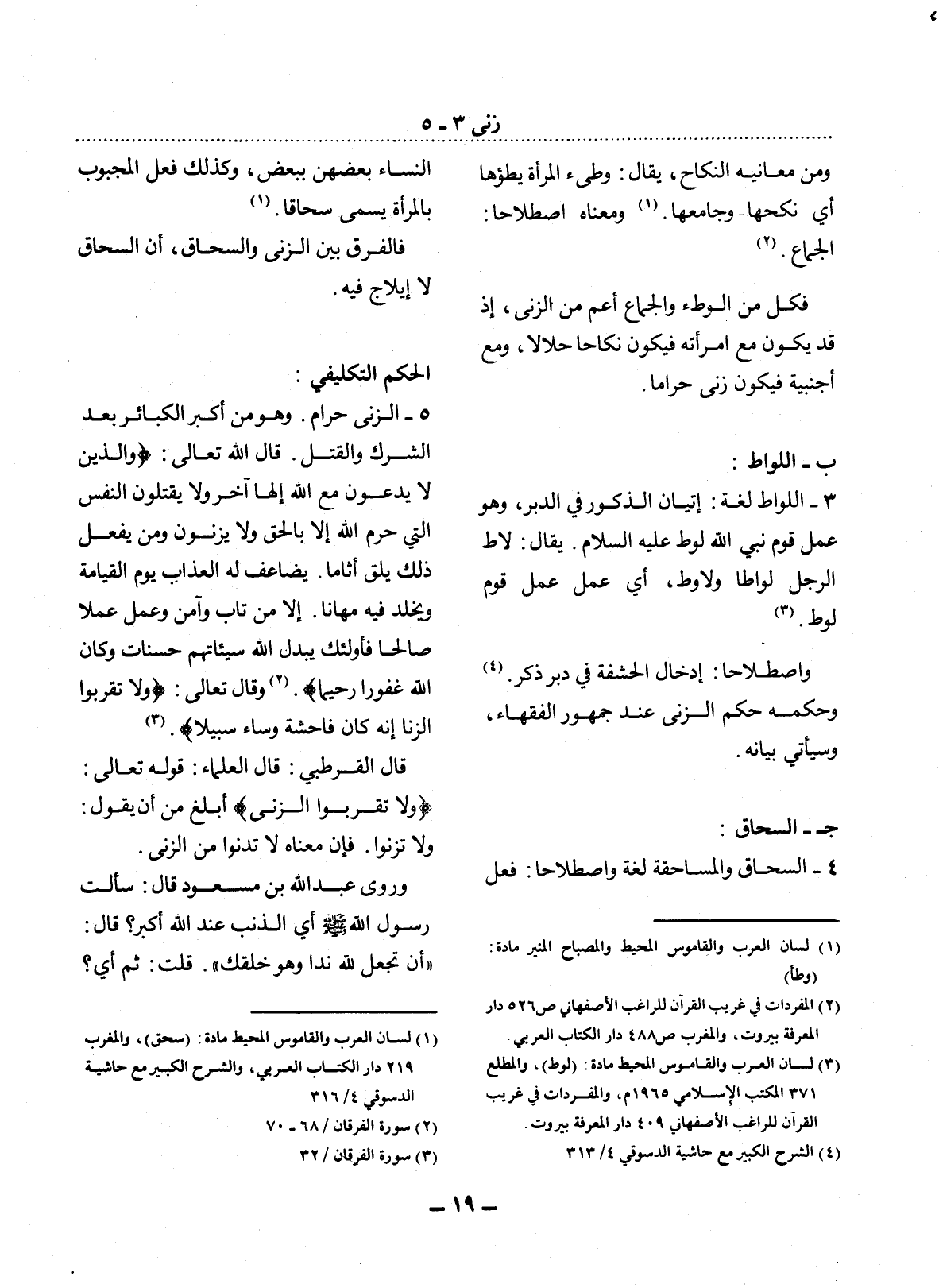 5 - الزِّنَى حَرَامٌ. وَهُوَ مِنْ أَكْبَرِ الْكَبَائِرِ بَعْدَ الشِّرْكِ وَالْقَتْل. قَال اللَّهُ تَعَالَى: {وَالَّذِينَ لاَ يَدْعُونَ مَعَ اللَّهِ إِلَهًا آخَرَ وَلاَ يَقْتُلُونَ النَّفْسَ الَّتِي حَرَّمَ اللَّهُ إِلاَّ بِالْحَقِّ وَلاَ يَزْنُونَ وَمَنْ يَفْعَل ذَلِكَ يَلْقَ أَثَامًا يُضَاعَفْ لَهُ الْعَذَابُ يَوْمَ الْقِيَامَةِ وَيَخْلُدْ فِيهِ مُهَانًا إِلاَّ مَنْ تَابَ وَآمَنَ وَعَمِل عَمَلاً صَالِحًا فَأُولَئِكَ يُبَدِّل اللَّهُ سَيِّئَاتِهِمْ حَسَنَاتٍ وَكَانَ اللَّهُ غَفُورًا رَحِيمًا} (2) . وَقَال تَعَالَى: {وَلاَ تَقْرَبُوا الزِّنَا إِنَّهُ كَانَ فَاحِشَةً وَسَاءَ سَبِيلاً} . (3)