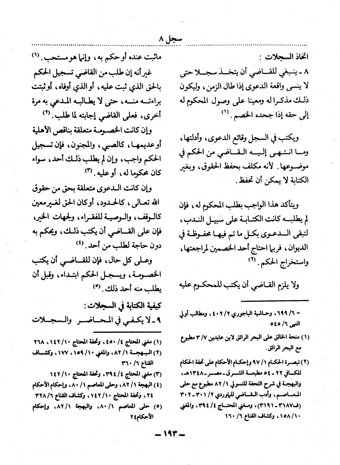 8 - يَنْبَغِي لِلْقَاضِي أَنْ يَتَّخِذَ سِجِلًّا حَتَّى لاَ يَنْسَى وَاقِعَةَ الدَّعْوَى إِذَا طَال الزَّمَنُ، وَلِيَكُونَ ذَلِكَ مُذَكِّرًا لَهُ وَمُعِينًا عَلَى وُصُول الْمَحْكُومِ لَهُ إِلَى حَقِّهِ إِذَا جَحَدَهُ الْخَصْمُ (1) .