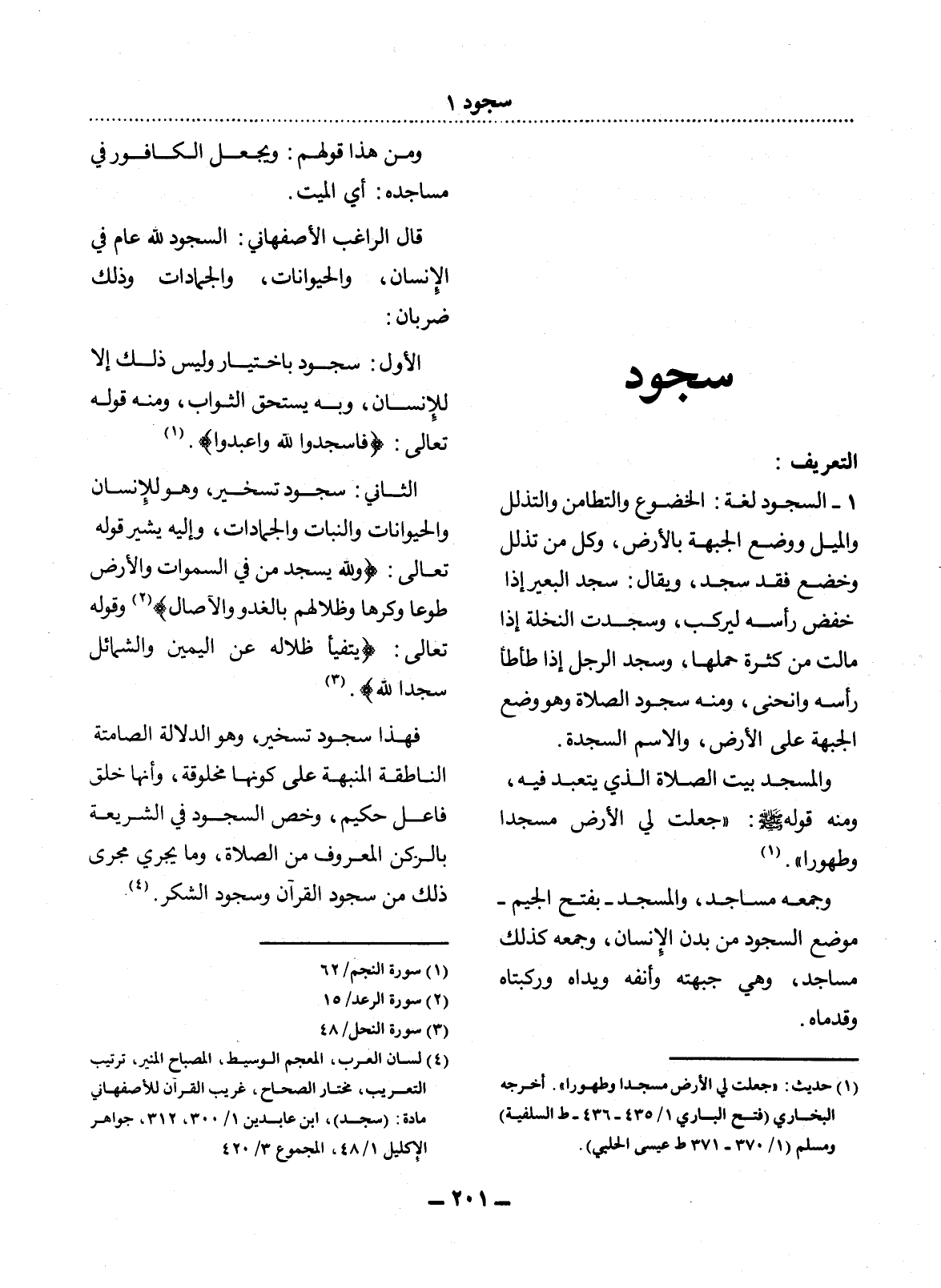 (4) لسان العرب، المعجم الوسيط، المصباح المنير، ترتيب التعريب، مختار الصحاح، غريب القرآن للأصفهاني مادة: (سجد) ، ابن عابدين 1 / 300، 312، جواهر الإكليل 1 / 48، المجموع 3 / 420.