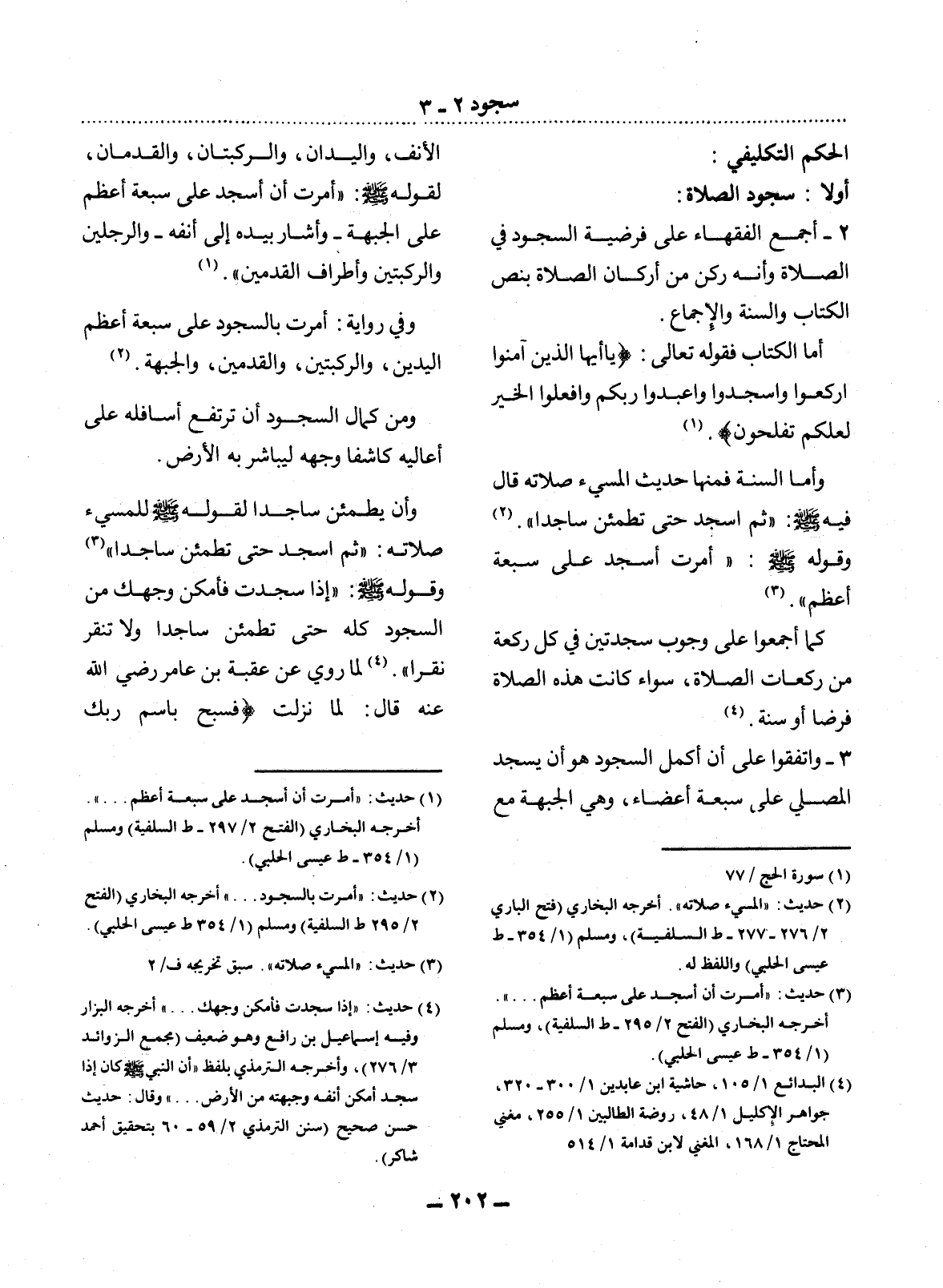 (1) حديث: " أمرت أن أسجد على سبعة أعظم. . . . ". أخرجه البخاري (الفتح 2 / 297 - ط السلفية) ومسلم (1 / 354 - ط عيسى الحلبي) .