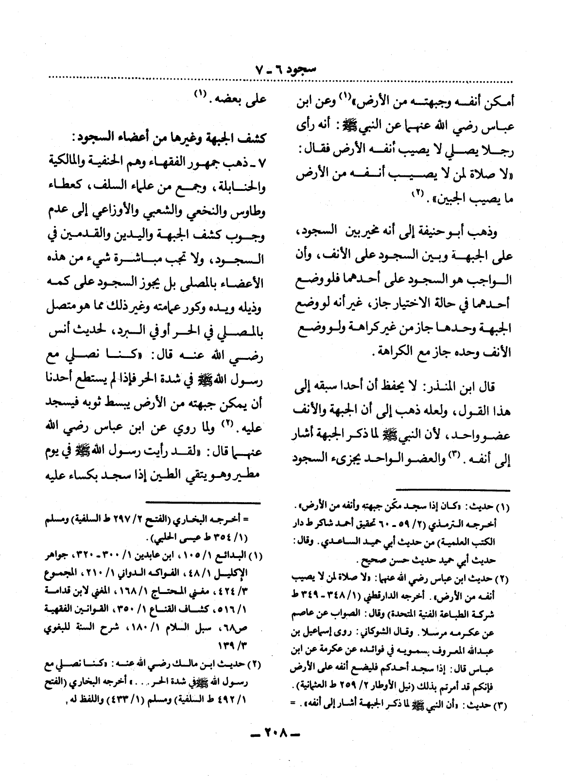 7 - ذَهَبَ جُمْهُورُ الْفُقَهَاءِ وَهُمُ الْحَنَفِيَّةُ وَالْمَالِكِيَّةُ وَالْحَنَابِلَةُ، وَجَمْعٌ مِنْ عُلَمَاءِ السَّلَفِ، كَعَطَاءٍ وَطَاوُسٍ وَالنَّخَعِيِّ وَالشَّعْبِيِّ وَالأَْوْزَاعِيِّ إِلَى عَدَمِ وُجُوبِ كَشْفِ الْجَبْهَةِ وَالْيَدَيْنِ وَالْقَدَمَيْنِ فِي السُّجُودِ، وَلاَ تَجِبُ مُبَاشَرَةُ شَيْءٍ مِنْ هَذِهِ الأَْعْضَاءِ بِالْمُصَلَّى بَل يَجُوزُ السُّجُودُ عَلَى كُمِّهِ وَذَيْلِهِ وَيَدِهِ وَكَوْرِ عِمَامَتِهِ وَغَيْرِ ذَلِكَ مِمَّا هُوَ مُتَّصِلٌ بِالْمُصَلِّي فِي الْحَرِّ أَوْ فِي الْبَرْدِ، لِحَدِيثِ أَنَسٍ رَضِيَ اللَّهُ عَنْهُ قَال: كُنَّا نُصَلِّي مَعَ رَسُول اللَّهِ صَلَّى اللَّهُ عَلَيْهِ وَسَلَّمَ فِي شِدَّةِ الْحَرِّ فَإِذَا لَمْ يَسْتَطِعْ أَحَدُنَا أَنْ يُمَكِّنَ جَبْهَتَهُ مِنَ الأَْرْضِ يَبْسُطُ ثَوْبَهُ فَيَسْجُدُ عَلَيْهِ. وَلِمَا رُوِيَ عَنِ ابْنِ عَبَّاسٍ رَضِيَ اللَّهُ عَنْهُمَا قَال: " لَقَدْ رَأَيْتُ رَسُول اللَّهِ صَلَّى اللَّهُ عَلَيْهِ وَسَلَّمَ فِي يَوْمٍ مَطِيرٍ وَهُوَ يَتَّقِي الطِّينَ إِذَا سَجَدَ بِكِسَاءٍ عَلَيْهِ