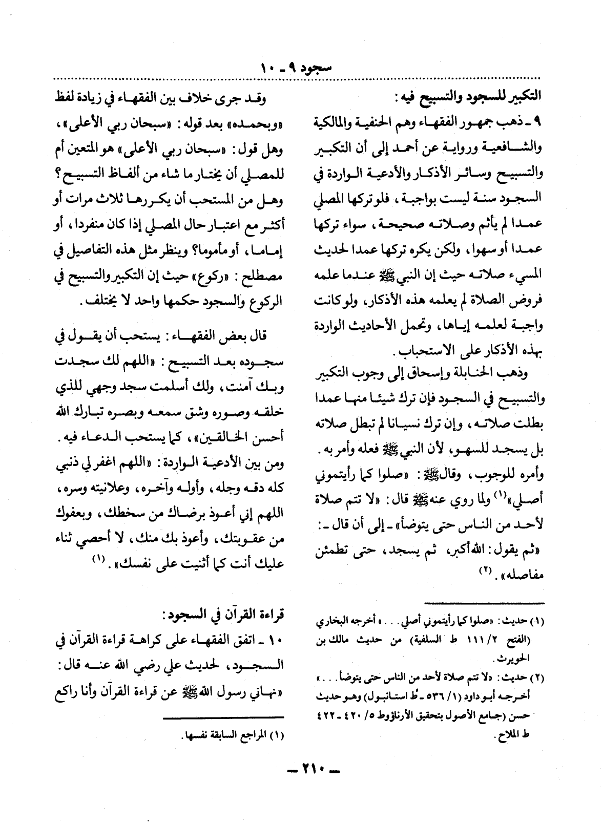 10 - اتَّفَقَ الْفُقَهَاءُ عَلَى كَرَاهَةِ قِرَاءَةِ الْقُرْآنِ فِي السُّجُودِ، لِحَدِيثِ عَلِيٍّ رَضِيَ اللَّهُ عَنْهُ قَال: نَهَانِي رَسُول اللَّهِ صَلَّى اللَّهُ عَلَيْهِ وَسَلَّمَ عَنْ قِرَاءَةِ الْقُرْآنِ وَأَنَا رَاكِعٌ