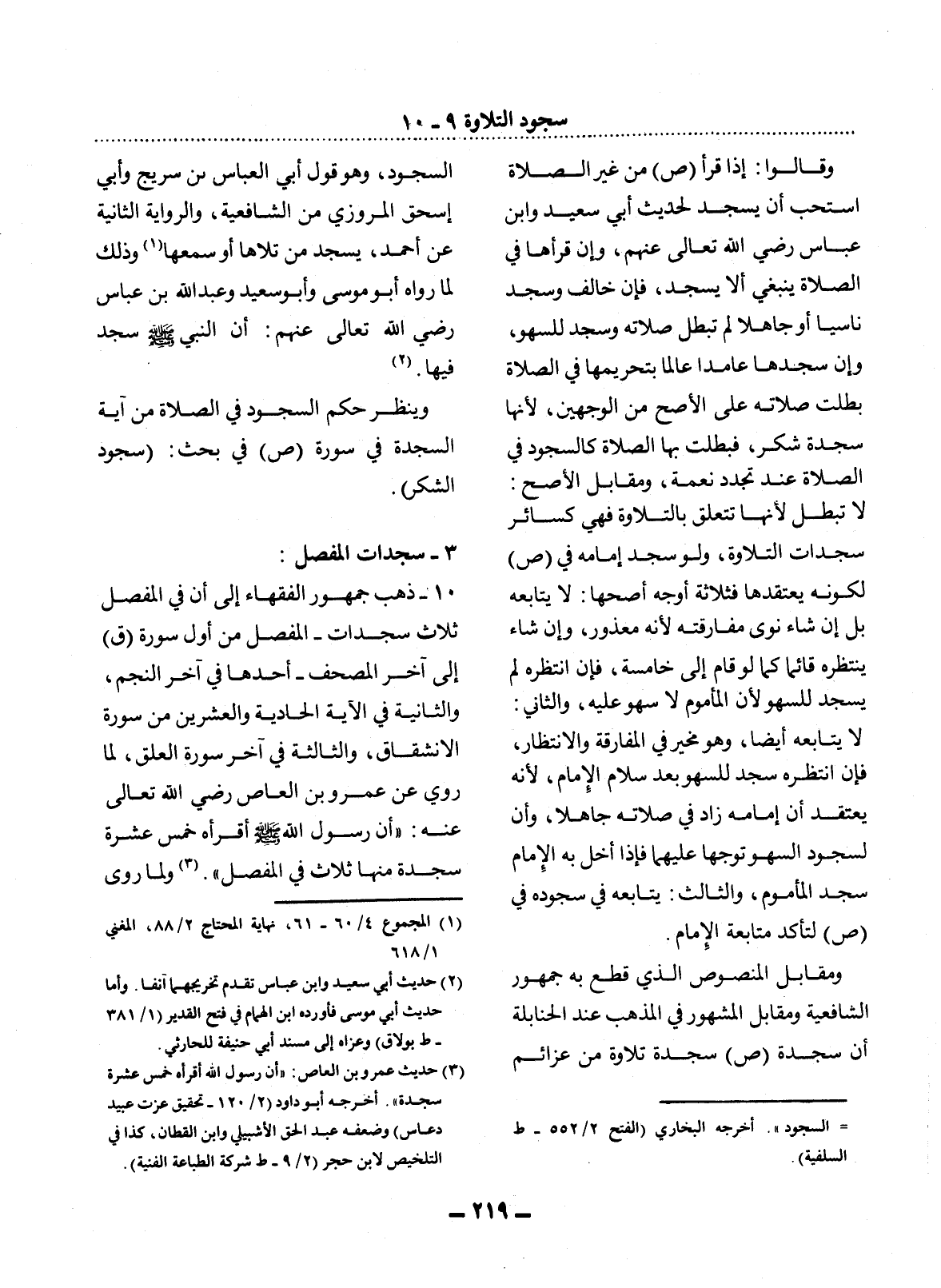 10 - ذَهَبَ جُمْهُورُ الْفُقَهَاءِ إِلَى أَنَّ فِي الْمُفَصَّل ثَلاَثَ سَجَدَاتٍ - الْمُفَصَّل مِنْ أَوَّل سُورَةِ (ق) إِلَى آخِرِ الْمُصْحَفِ - أَحَدُهَا فِي آخِرِ النَّجْمِ، وَالثَّانِيَةُ فِي الآْيَةِ الْحَادِيَةِ وَالْعِشْرِينَ مِنْ سُورَةِ الاِنْشِقَاقِ، وَالثَّالِثَةُ فِي آخِرِ سُورَةِ الْعَلَقِ، لِمَا رُوِيَ عَنْ عَمْرِو بْنِ الْعَاصِ رَضِيَ اللَّهُ تَعَالَى عَنْهُ: أَنَّ رَسُول اللَّهِ صَلَّى اللَّهُ عَلَيْهِ وَسَلَّمَ أَقْرَأَهُ خَمْسَ عَشْرَةَ سَجْدَةً مِنْهَا ثَلاَثٌ فِي الْمُفَصَّل. (3) وَلِمَا رَوَى