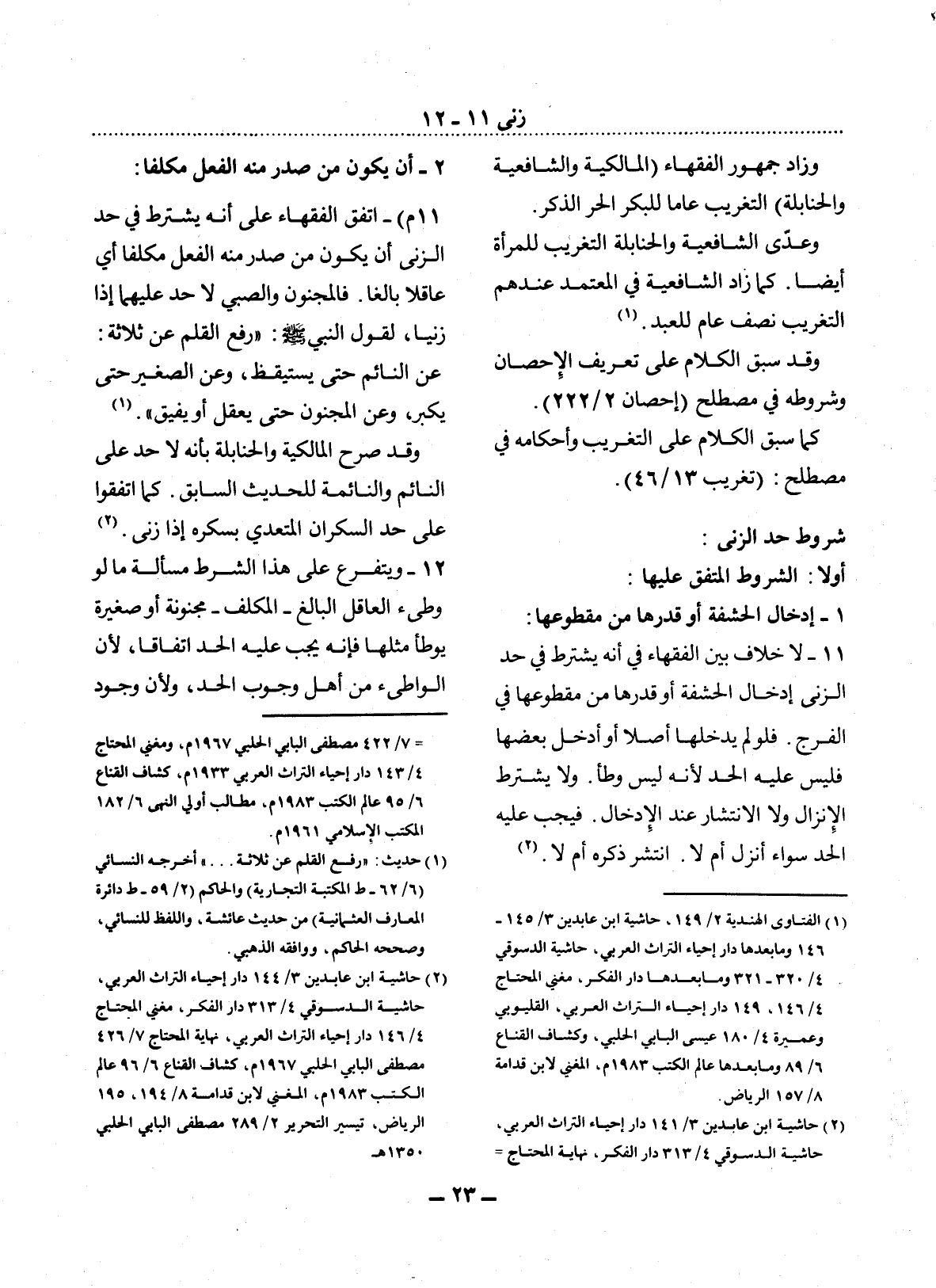 (11 م) - اتَّفَقَ الْفُقَهَاءُ عَلَى أَنَّهُ يُشْتَرَطُ فِي حَدِّ الزِّنَى أَنْ يَكُونَ مَنْ صَدَرَ مِنْهُ الْفِعْل مُكَلَّفًا أَيْ عَاقِلاً بَالِغًا. فَالْمَجْنُونُ وَالصَّبِيُّ لاَ حَدَّ عَلَيْهِمَا إِذَا زَنَيَا، لِقَوْل النَّبِيِّ صَلَّى اللَّهُ عَلَيْهِ وَسَلَّمَ: رُفِعَ الْقَلَمُ عَنْ ثَلاَثَةٍ: عَنِ النَّائِمِ حَتَّى يَسْتَيْقِظَ، وَعَنِ الصَّغِيرِ حَتَّى يَكْبُرَ، وَعَنِ الْمَجْنُونِ حَتَّى يَعْقِل أَوْ يُفِيقَ (1) .