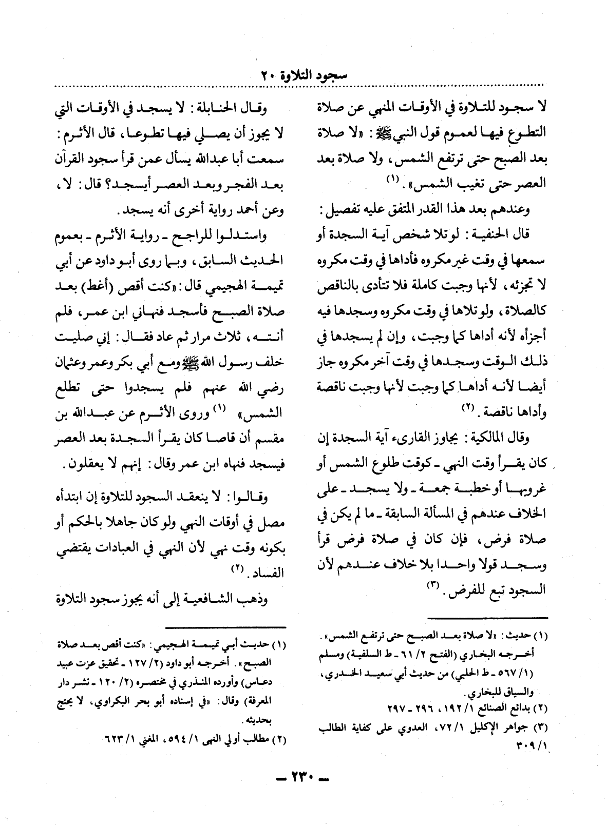 لاَ سُجُودَ لِلتِّلاَوَةِ فِي الأَْوْقَاتِ الْمَنْهِيِّ عَنْ صَلاَةِ التَّطَوُّعِ فِيهَا لِعُمُومِ قَوْل النَّبِيِّ صَلَّى اللَّهُ عَلَيْهِ وَسَلَّمَ: لاَ صَلاَةَ بَعْدَ الصُّبْحِ حَتَّى تَرْتَفِعَ الشَّمْسُ، وَلاَ صَلاَةَ بَعْدَ الْعَصْرِ حَتَّى تَغِيبَ الشَّمْسُ. (1)