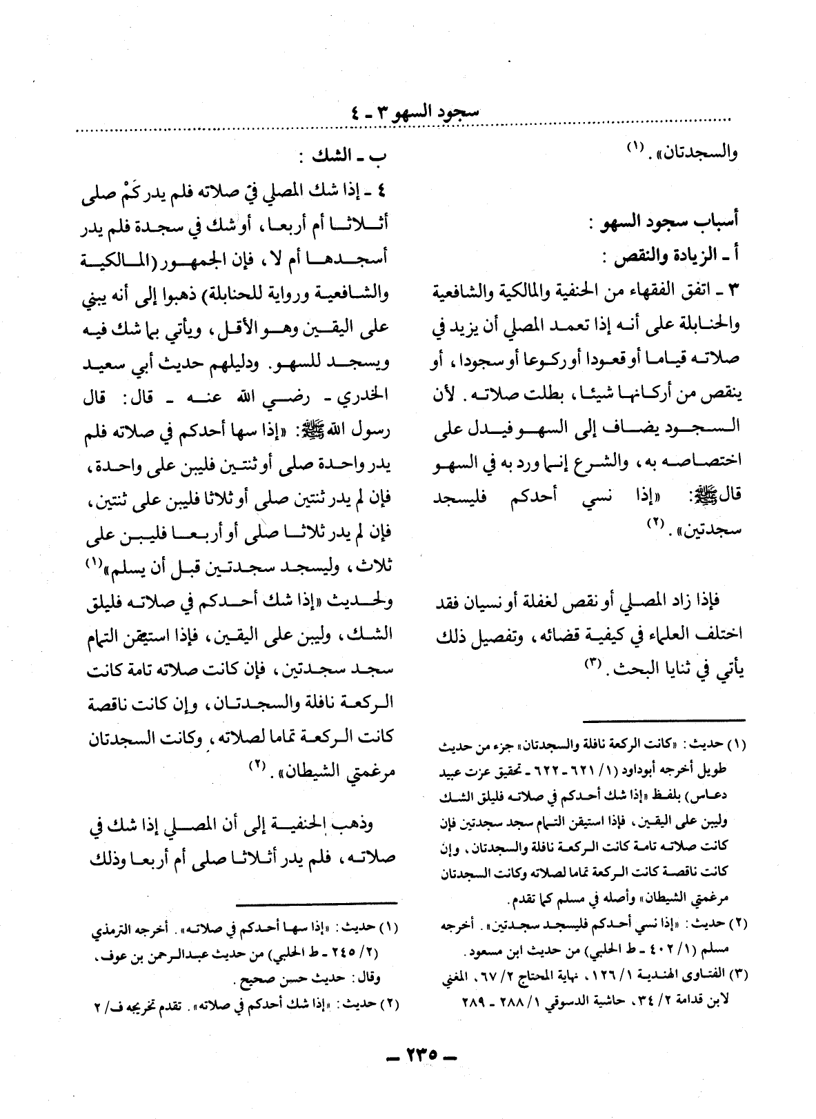 4 - إِذَا شَكَّ الْمُصَلِّي فِي صَلاَتِهِ فَلَمْ يَدْرِ كَمْ صَلَّى أَثَلاَثًا أَمْ أَرْبَعًا، أَوْ شَكَّ فِي سَجْدَةٍ فَلَمْ يَدْرِ أَسَجَدَهَا أَمْ لاَ، فَإِنَّ الْجُمْهُورَ (الْمَالِكِيَّةَ وَالشَّافِعِيَّةَ وَرِوَايَةً لِلْحَنَابِلَةِ) ذَهَبُوا إِلَى أَنَّهُ يَبْنِي عَلَى الْيَقِينِ وَهُوَ الأَْقَل، وَيَأْتِي بِمَا شَكَّ فِيهِ وَيَسْجُدُ لِلسَّهْوِ. وَدَلِيلُهُمْ حَدِيثُ أَبِي سَعِيدٍ الْخُدْرِيِّ - رَضِيَ اللَّهُ عَنْهُ - قَال: قَال رَسُول اللَّهِ صَلَّى اللَّهُ عَلَيْهِ وَسَلَّمَ: إِذَا سَهَا أَحَدُكُمْ فِي صَلاَتِهِ فَلَمْ يَدْرِ وَاحِدَةً صَلَّى أَوْ ثِنْتَيْنِ فَلْيَبْنِ عَلَى وَاحِدَةٍ، فَإِنْ لَمْ يَدْرِ ثِنْتَيْنِ صَلَّى أَوْ ثَلاَثًا فَلْيَبْنِ عَلَى ثِنْتَيْنِ، فَإِنْ لَمْ يَدْرِ ثَلاَثًا صَلَّى أَوْ أَرْبَعًا فَلْيَبْنِ عَلَى ثَلاَثٍ، وَلْيَسْجُدْ سَجْدَتَيْنِ قَبْل أَنْ يُسَلِّمَ (1) وَلِحَدِيثِ إِذَا شَكَّ أَحَدُكُمْ فِي صَلاَتِهِ فَلْيُلْقِ الشَّكَّ، وَلْيَبْنِ عَلَى الْيَقِينِ، فَإِذَا اسْتَيْقَنَ التَّمَامَ سَجَدَ سَجْدَتَيْنِ، فَإِنْ كَانَتْ صَلاَتُهُ تَامَّةً كَانَتِ الرَّكْعَةُ نَافِلَةً وَالسَّجْدَتَانِ، وَإِنْ كَانَتْ نَاقِصَةً كَانَتِ الرَّكْعَةُ تَمَامًا لِصَلاَتِهِ، وَكَانَتِ السَّجْدَتَانِ مُرْغِمَتَيِ الشَّيْطَانِ.
