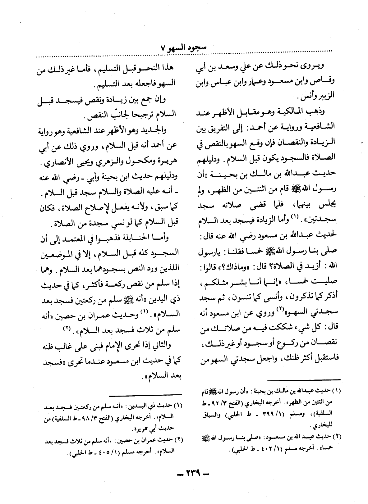(2) حديث عمران بن حصين: " أنه سلم من ثلاث فسجد بعد السلام ". أخرجه مسلم (1 / 405 - ط الحلبي) .