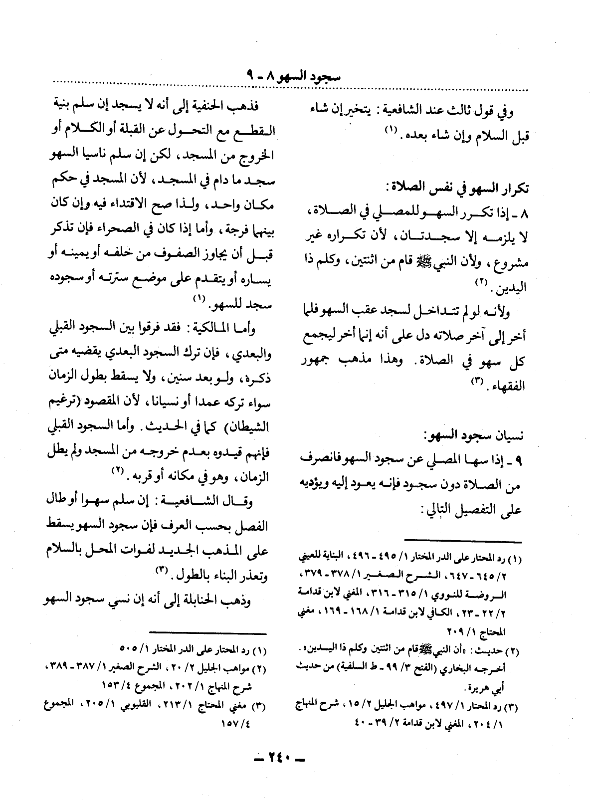 8 - إِذَا تَكَرَّرَ السَّهْوُ لِلْمُصَلِّي فِي الصَّلاَةِ، لاَ يَلْزَمُهُ إِلاَّ سَجْدَتَانِ؛ لأَِنَّ تَكْرَارَهُ غَيْرُ مَشْرُوعٍ، وَلأَِنَّ النَّبِيَّ صَلَّى اللَّهُ عَلَيْهِ وَسَلَّمَ قَامَ مِنَ اثْنَتَيْنِ، وَكَلَّمَ ذَا الْيَدَيْنِ. (2)