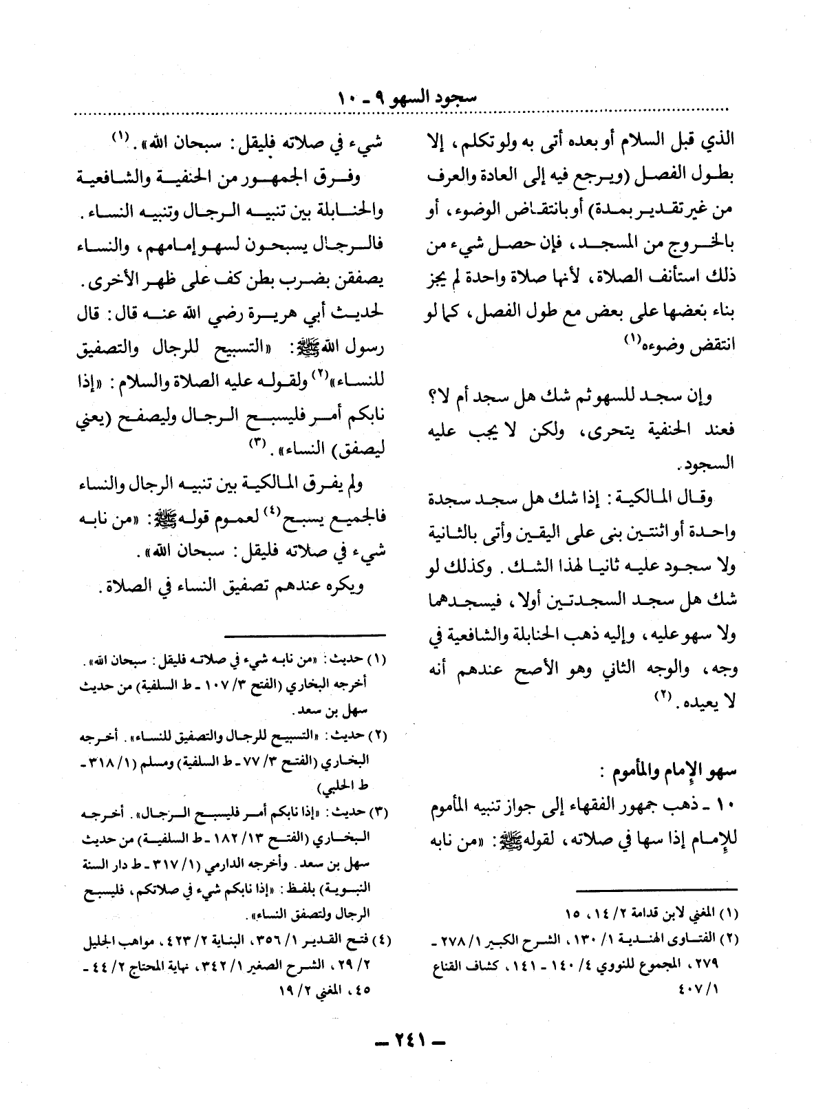 10 - ذَهَبَ جُمْهُورُ الْفُقَهَاءِ إِلَى جَوَازِ تَنْبِيهِ الْمَأْمُومِ لِلإِْمَامِ إِذَا سَهَا فِي صَلاَتِهِ، لِقَوْلِهِ صَلَّى اللَّهُ عَلَيْهِ وَسَلَّمَ: مَنْ نَابَهُ