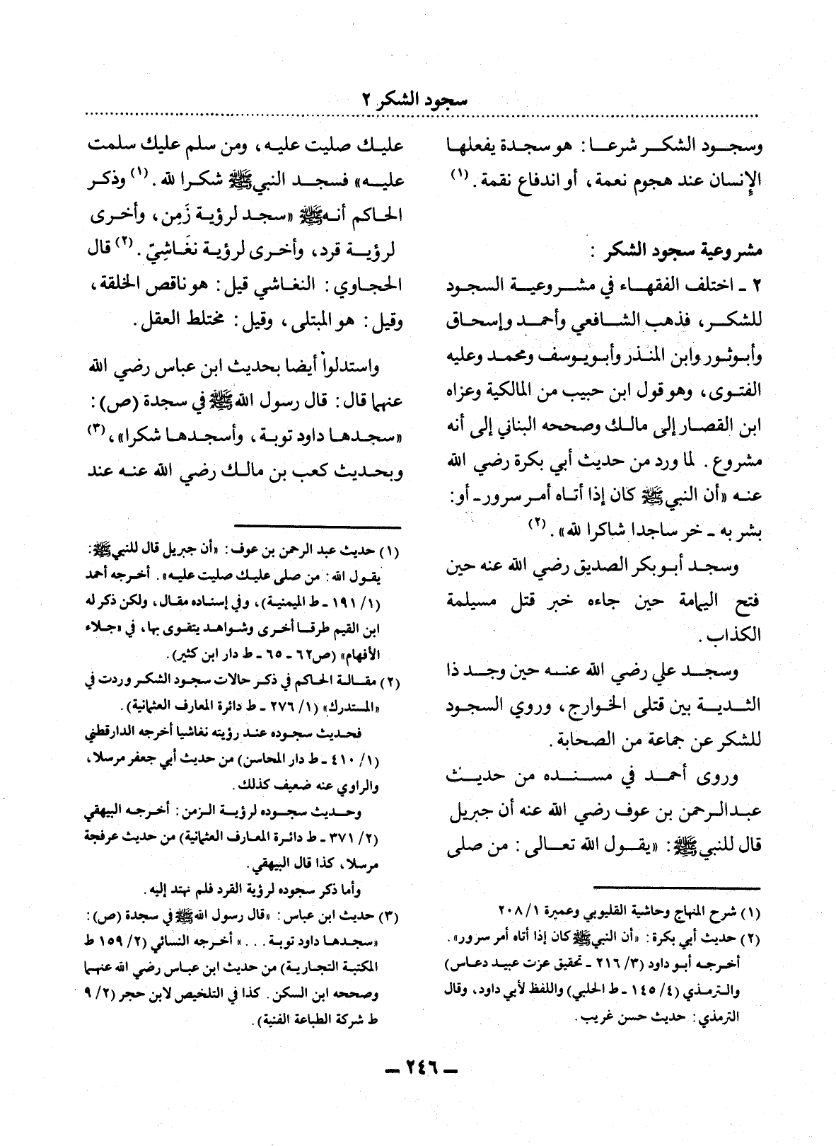 (2) مقالة الحاكم في ذكر حالات سجود الشكر وردت في " المستدرك " (1 / 276 - ط دائرة المعارف العثمانية) . فحديث " سجوده عند رؤيته نغاشيًّا " أخرجه الدارقطني (1 / 410 - ط دار المحاسن) من حديث أبي جعفر مرسلا، والراوي عنه ضعيف كذلك. وحديث سجوده لرؤية الزمن: أخرجه البيهقي (2 / 371 - ط دائرة المعارف العثمانية) من حديث عرفجة مرسلا، كذا قال البيهقي. وأما ذكر سجوده لرؤية القرد فلم نهتد إليه.