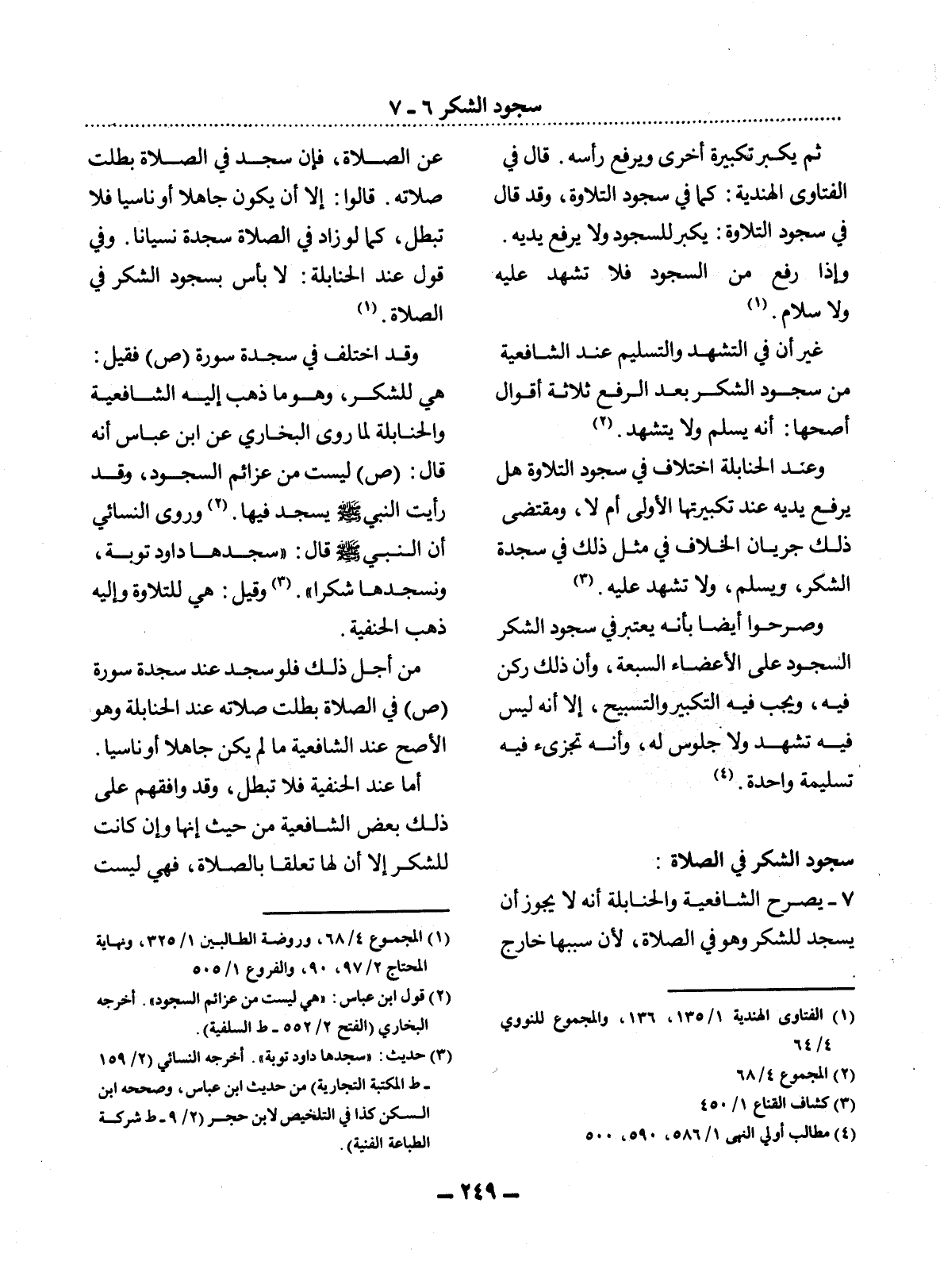 عَنِ الصَّلاَةِ، فَإِنْ سَجَدَ فِي الصَّلاَةِ بَطَلَتْ صَلاَتُهُ. قَالُوا: إِلاَّ أَنْ يَكُونَ جَاهِلاً أَوْ نَاسِيًا فَلاَ تَبْطُل، كَمَا لَوْ زَادَ فِي الصَّلاَةِ سَجْدَةً نِسْيَانًا. وَفِي قَوْلٍ عِنْدَ الْحَنَابِلَةِ: لاَ بَأْسَ بِسُجُودِ الشُّكْرِ فِي الصَّلاَةِ. (1)