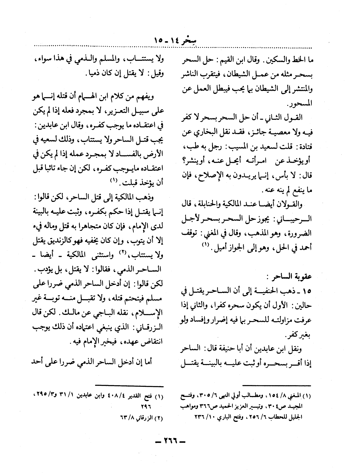 15 - ذَهَبَ الْحَنَفِيَّةُ إِلَى أَنَّ السَّاحِرَ يُقْتَل فِي حَالَيْنِ: الأَْوَّل أَنْ يَكُونَ سِحْرُهُ كُفْرًا، وَالثَّانِي إِذَا عُرِفَتْ مُزَاوَلَتُهُ لِلسِّحْرِ بِمَا فِيهِ إِضْرَارٌ وَإِفْسَادٌ وَلَوْ بِغَيْرِ كُفْرٍ.
