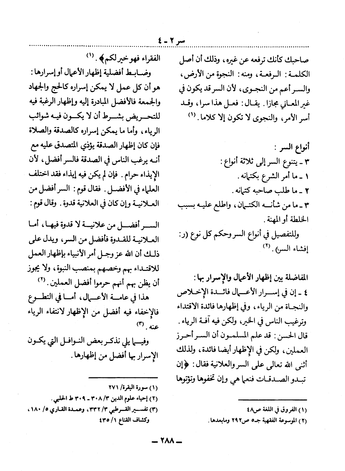 4 - إِنَّ فِي إِسْرَارِ الأَْعْمَال فَائِدَةَ الإِْخْلاَصِ وَالنَّجَاةِ مِنَ الرِّيَاءِ، وَفِي إِظْهَارِهَا فَائِدَةُ الاِقْتِدَاءِ وَتَرْغِيبُ النَّاسِ فِي الْخَيْرِ، وَلَكِنْ فِيهِ آفَةُ الرِّيَاءِ. قَال الْحَسَنُ: قَدْ عَلِمَ الْمُسْلِمُونَ أَنَّ السِّرَّ أَحْرَزُ الْعَمَلَيْنِ، وَلَكِنْ فِي الإِْظْهَارِ أَيْضًا فَائِدَةٌ، وَلِذَلِكَ أَثْنَى اللَّهُ تَعَالَى عَلَى السِّرِّ وَالْعَلاَنِيَةِ فَقَال: {إِنْ تُبْدُوا الصَّدَقَاتِ فَنِعِمَّا هِيَ وَإِنْ تُخْفُوهَا وَتُؤْتُوهَا