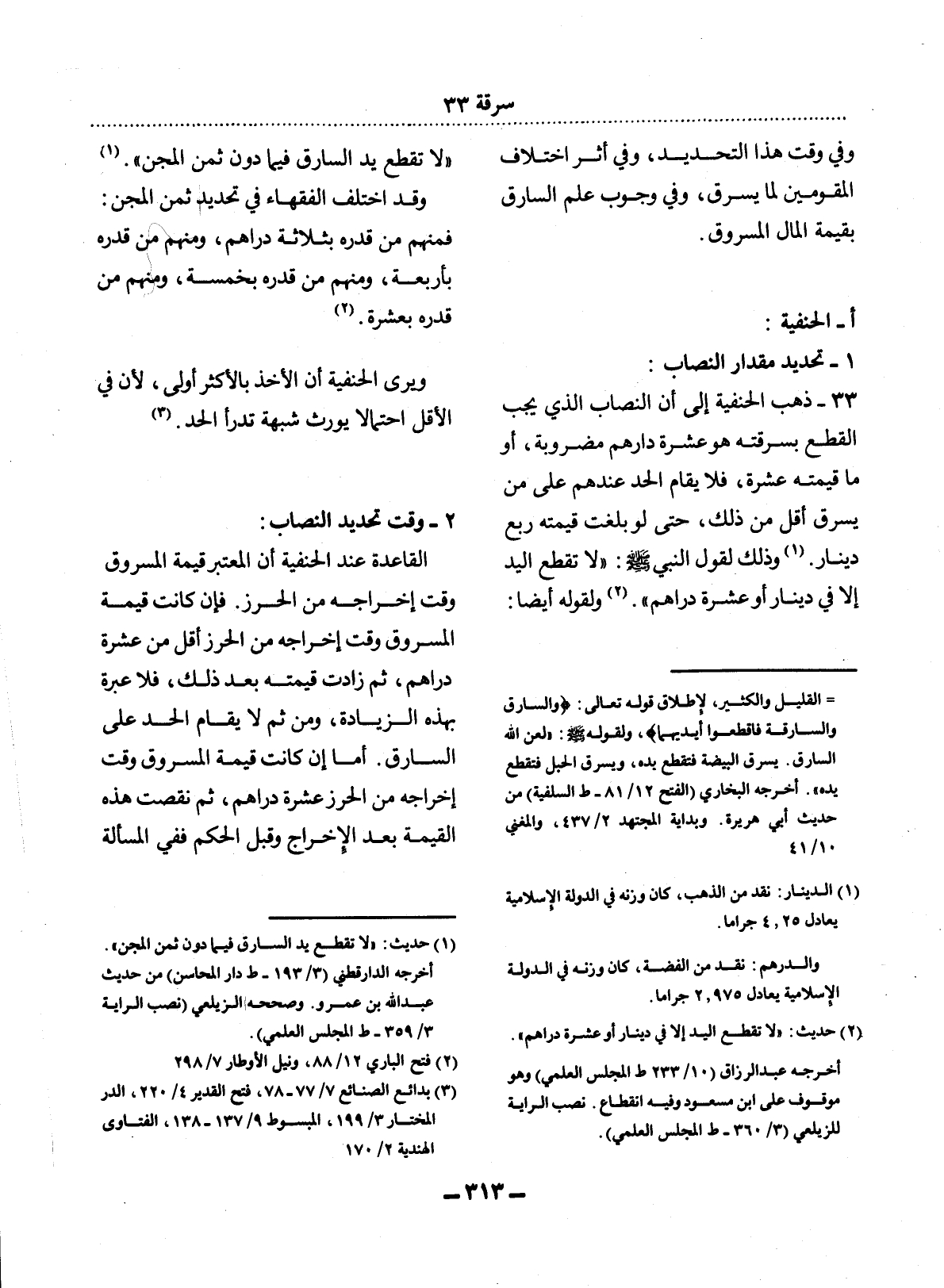 33 - ذَهَبَ الْحَنَفِيَّةُ إِلَى أَنَّ النِّصَابَ الَّذِي يَجِبُ الْقَطْعُ بِسَرِقَتِهِ هُوَ عَشْرَةُ دَارَهُمْ مَضْرُوبَةً، أَوْ مَا قِيمَتُهُ عَشْرَةٌ، فَلاَ يُقَامُ الْحَدُّ عِنْدَهُمْ عَلَى مَنْ يَسْرِقُ أَقَل مِنْ ذَلِكَ، حَتَّى لَوْ بَلَغَتْ قِيمَتُهُ رُبُعَ دِينَارٍ (1) . وَذَلِكَ لِقَوْل النَّبِيِّ صَلَّى اللَّهُ عَلَيْهِ وَسَلَّمَ: لاَ تُقْطَعُ الْيَدُ إِلاَّ فِي دِينَارٍ أَوْ عَشَرَةِ دَرَاهِمَ (2) . وَلِقَوْلِهِ أَيْضًا: {