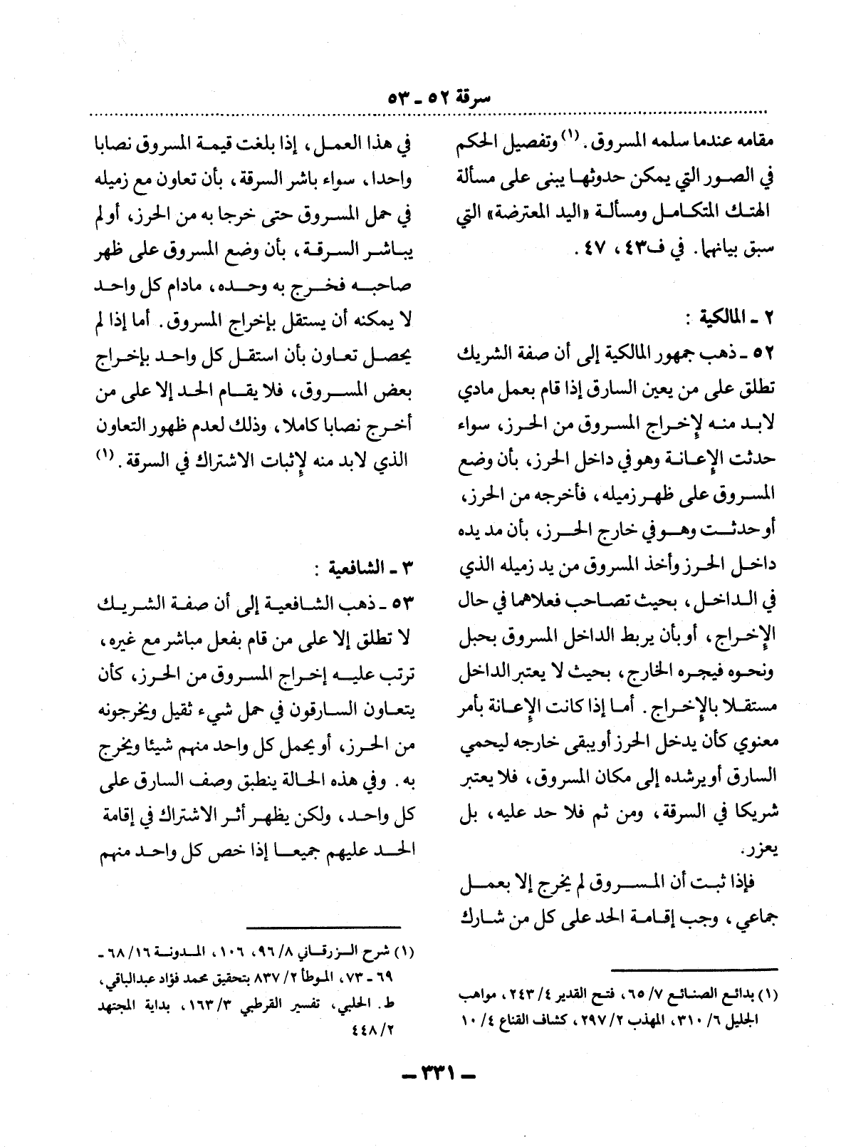 53 - ذَهَبَ الشَّافِعِيَّةُ إِلَى أَنَّ صِفَةَ الشَّرِيكِ لاَ تُطْلَقُ إِلاَّ عَلَى مَنْ قَامَ بِفِعْلٍ مُبَاشِرٍ مَعَ غَيْرِهِ، تَرَتَّبَ عَلَيْهِ إِخْرَاجُ الْمَسْرُوقِ مِنَ الْحِرْزِ، كَأَنْ يَتَعَاوَنَ السَّارِقُونَ فِي حَمْل شَيْءٍ ثَقِيلٍ وَيُخْرِجُونَهُ مِنَ الْحِرْزِ، أَوْ يَحْمِل كُل وَاحِدٍ مِنْهُمْ شَيْئًا وَيَخْرُجَ بِهِ. وَفِي هَذِهِ الْحَالَةِ يَنْطَبِقُ وَصْفُ السَّارِقِ عَلَى كُل وَاحِدٍ، وَلَكِنْ يَظْهَرُ أَثَرُ الاِشْتِرَاكِ فِي إِقَامَةِ الْحَدِّ عَلَيْهِمْ جَمِيعًا إِذَا خَصَّ كُل وَاحِدٍ مِنْهُمْ