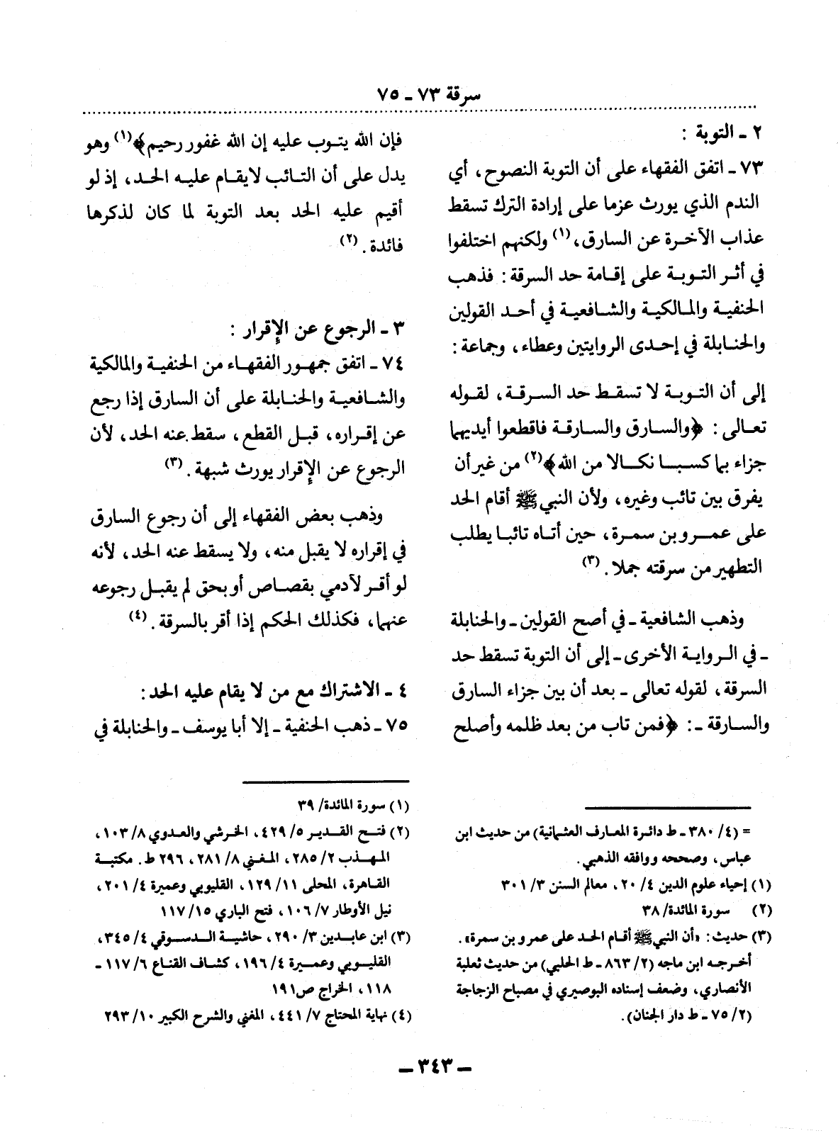 73 - اتَّفَقَ الْفُقَهَاءُ عَلَى أَنَّ التَّوْبَةَ النَّصُوحَ، أَيِ النَّدَمَ الَّذِي يُورِثُ عَزْمًا عَلَى إِرَادَةِ التَّرْكِ تُسْقِطُ عَذَابَ الآْخِرَةِ عَنِ السَّارِقِ (1) ، وَلَكِنَّهُمُ اخْتَلَفُوا فِي أَثَرِ التَّوْبَةِ عَلَى إِقَامَةِ حَدِّ السَّرِقَةِ: فَذَهَبَ الْحَنَفِيَّةُ وَالْمَالِكِيَّةُ وَالشَّافِعِيَّةُ فِي أَحَدِ الْقَوْلَيْنِ وَالْحَنَابِلَةُ فِي إِحْدَى الرِّوَايَتَيْنِ وَعَطَاءٌ، وَجَمَاعَةٌ: إِلَى أَنَّ التَّوْبَةَ لاَ تُسْقِطُ حَدَّ السَّرِقَةِ، لِقَوْلِهِ تَعَالَى: {وَالسَّارِقُ وَالسَّارِقَةُ فَاقْطَعُوا أَيْدِيَهُمَا جَزَاءً بِمَا كَسَبَا نَكَالاً مِنَ اللَّهِ} (2) مِنْ غَيْرِ أَنْ يُفَرِّقَ بَيْنَ تَائِبٍ وَغَيْرِهِ، وَلأَِنَّ النَّبِيَّ صَلَّى اللَّهُ عَلَيْهِ وَسَلَّمَ أَقَامَ الْحَدَّ عَلَى عَمْرِو بْنِ سَمُرَةَ، حِينَ أَتَاهُ تَائِبًا يَطْلُبُ التَّطْهِيرَ مِنْ سَرِقَتِهِ جَمَلاً (3) .