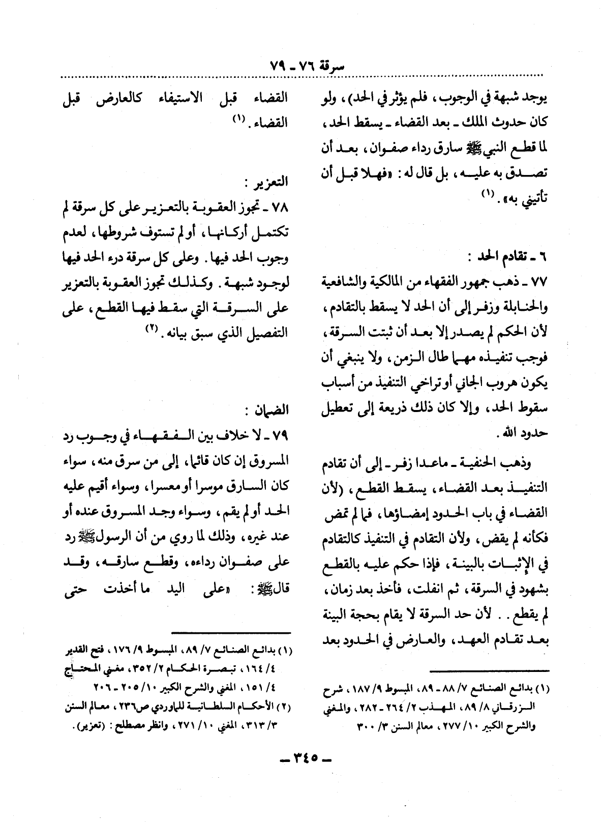 78 - تَجُوزُ الْعُقُوبَةُ بِالتَّعْزِيرِ عَلَى كُل سَرِقَةٍ لَمْ تَكْتَمِل أَرْكَانُهَا، أَوْ لَمْ تَسْتَوْفِ شُرُوطُهَا؛ لِعَدَمِ وُجُوبِ الْحَدِّ فِيهَا. وَعَلَى كُل سَرِقَةٍ دَرْءُ الْحَدِّ فِيهَا لِوُجُودِ شُبْهَةٍ. وَكَذَلِكَ تَجُوزُ الْعُقُوبَةُ بِالتَّعْزِيرِ عَلَى السَّرِقَةِ الَّتِي سَقَطَ فِيهَا الْقَطْعُ، عَلَى التَّفْصِيل الَّذِي سَبَقَ بَيَانُهُ (2) .