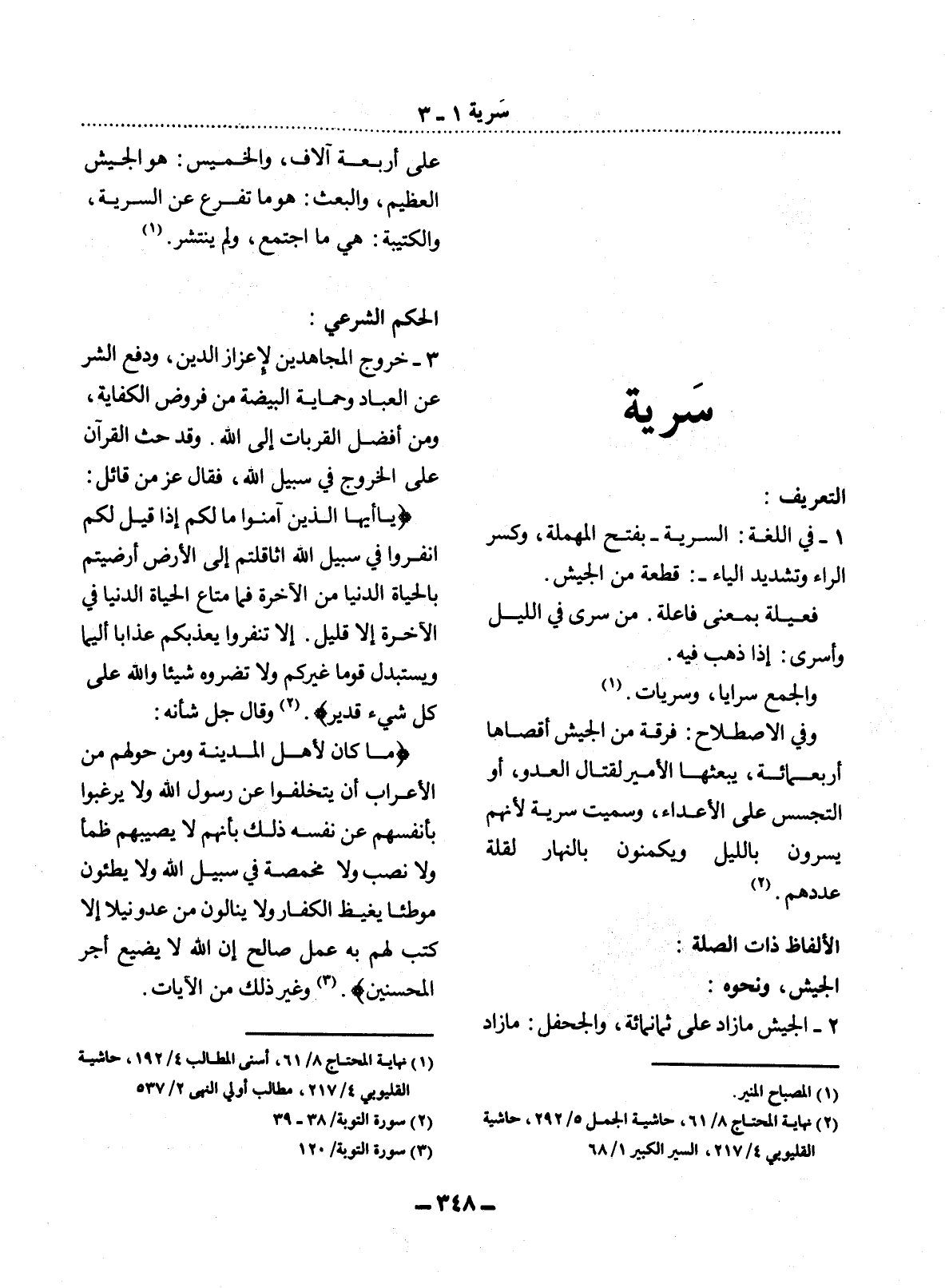 1 - فِي اللُّغَةِ: السَّرِيَّةُ - بِفَتْحِ الْمُهْمَلَةِ، وَكَسْرِ الرَّاءِ وَتَشْدِيدِ الْيَاءِ -: قِطْعَةٌ مِنَ الْجَيْشِ.