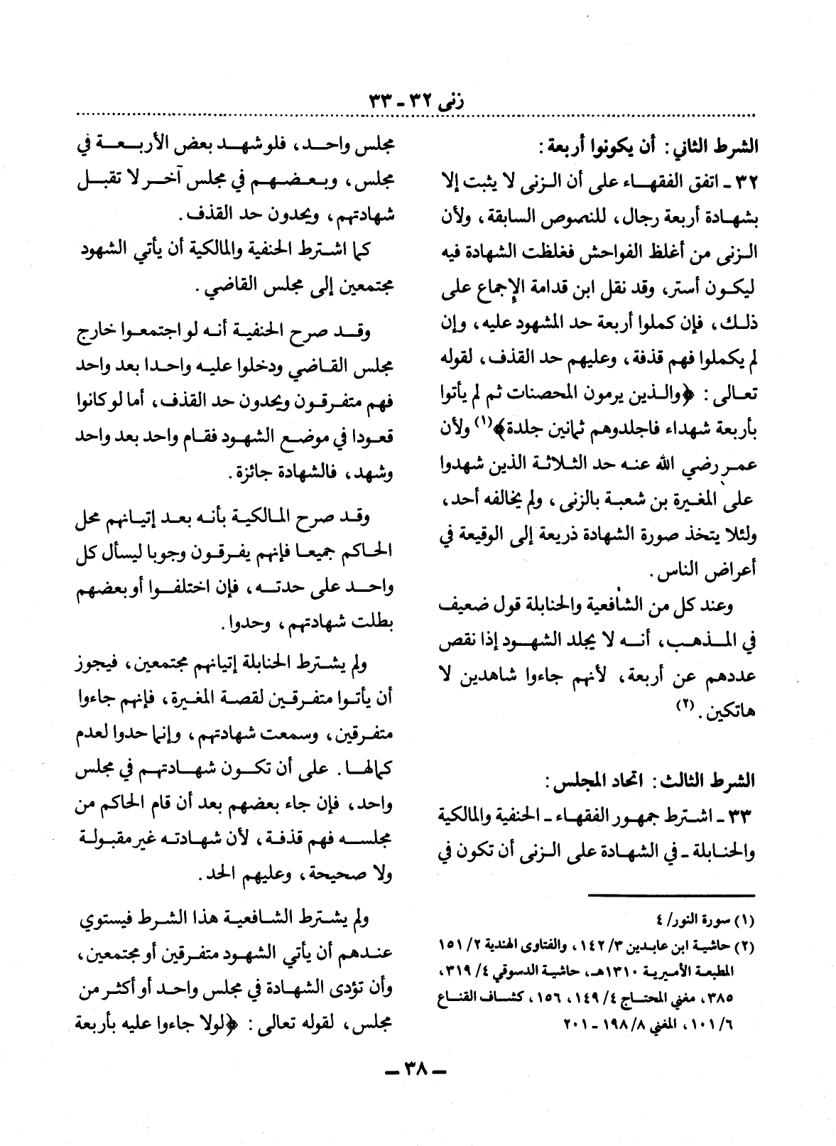 33 - اشْتَرَطَ جُمْهُورُ الْفُقَهَاءِ - الْحَنَفِيَّةُ وَالْمَالِكِيَّةُ وَالْحَنَابِلَةُ - فِي الشَّهَادَةِ عَلَى الزِّنَى أَنْ تَكُونَ فِي
