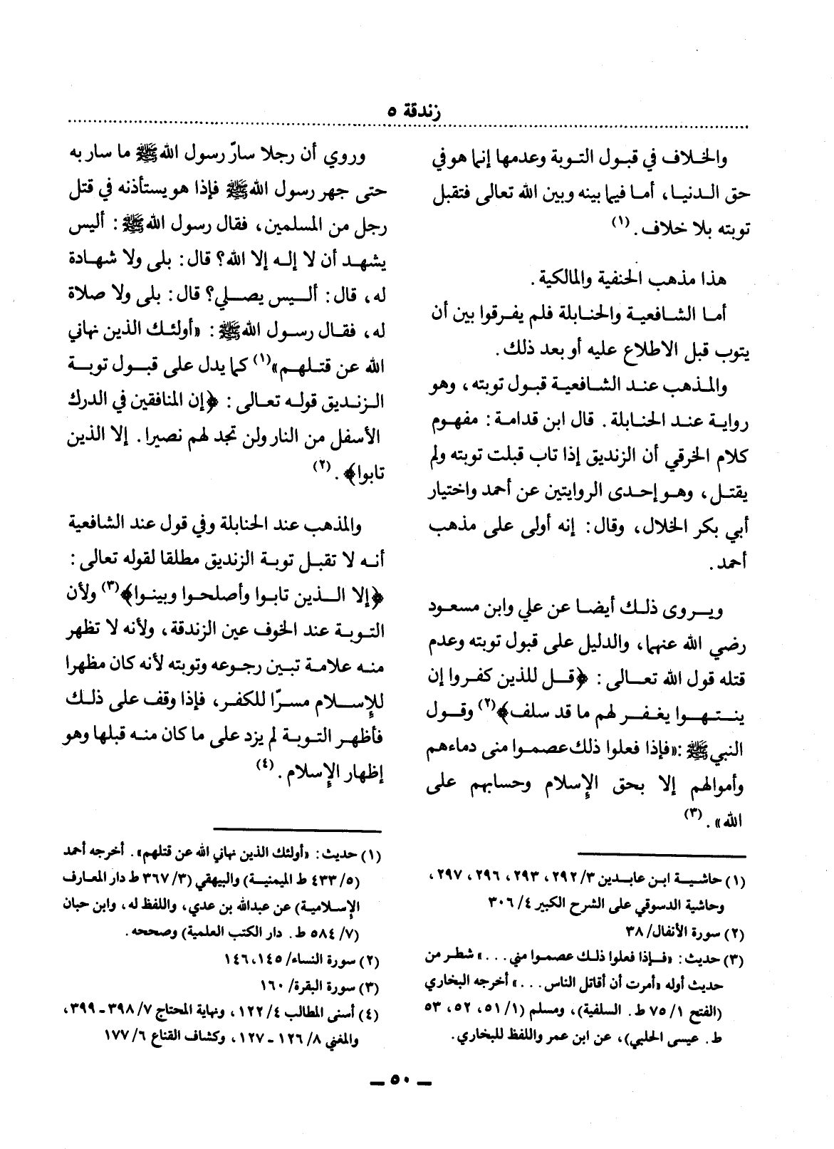 وَرُوِيَ أَنَّ رَجُلاً سَارَّ رَسُول اللَّهِ صَلَّى اللَّهُ عَلَيْهِ وَسَلَّمَ مَا سَارَّ بِهِ حَتَّى جَهَرَ رَسُول اللَّهِ صَلَّى اللَّهُ عَلَيْهِ وَسَلَّمَ فَإِذَا هُوَ يَسْتَأْذِنُهُ فِي قَتْل رَجُلٍ مِنَ الْمُسْلِمِينَ، فَقَال رَسُول اللَّهِ صَلَّى اللَّهُ عَلَيْهِ وَسَلَّمَ: أَلَيْسَ يَشْهَدُ أَنْ لاَ إِلَهَ إِلاَّ اللَّهُ؟ قَال: بَلَى وَلاَ شَهَادَةَ لَهُ، قَال: أَلَيْسَ يُصَلِّي؟ قَال: بَلَى وَلاَ صَلاَةَ لَهُ، فَقَال رَسُول اللَّهِ صَلَّى اللَّهُ عَلَيْهِ وَسَلَّمَ: أُولَئِكَ الَّذِينَ نَهَانِي اللَّهُ عَنْ قَتْلِهِمْ (1) كَمَا يَدُل عَلَى قَبُول تَوْبَةِ الزِّنْدِيقِ قَوْله تَعَالَى: {إِنَّ الْمُنَافِقِينَ فِي الدَّرْكِ الأَْسْفَل مِنَ النَّارِ وَلَنْ تَجِدَ لَهُمْ نَصِيرًا إِلاَّ الَّذِينَ تَابُوا} (2) .
