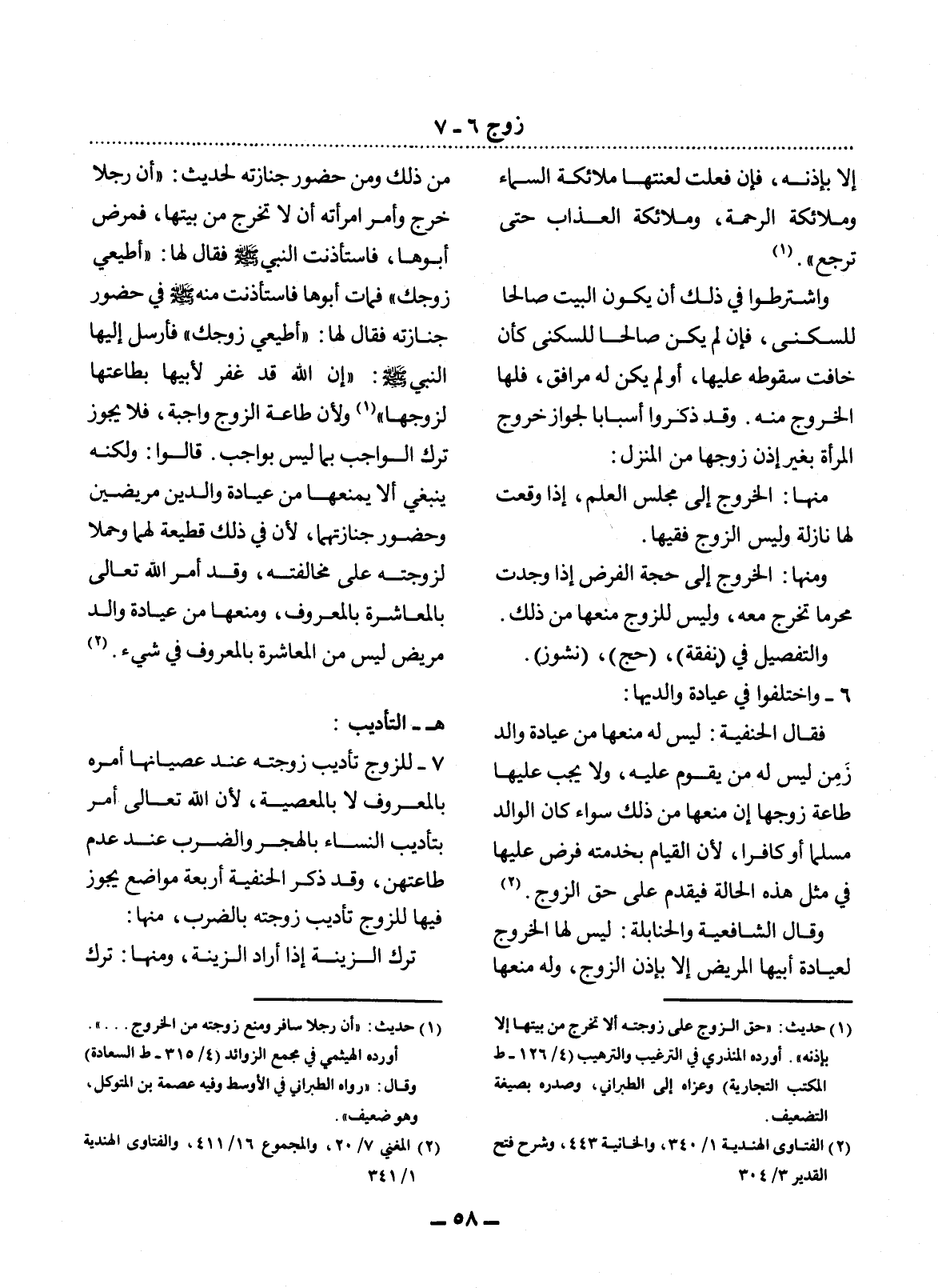 (1) حديث: " أن رجلا سافر ومنع زوجته من الخروج. . . ". أورده الهيثمي في مجمع الزوائد (4 / 315 - ط السعادة) وقال: " رواه الطبراني في الأوسط وفيه عصمة بن المتوكل، وهو ضعيف ".