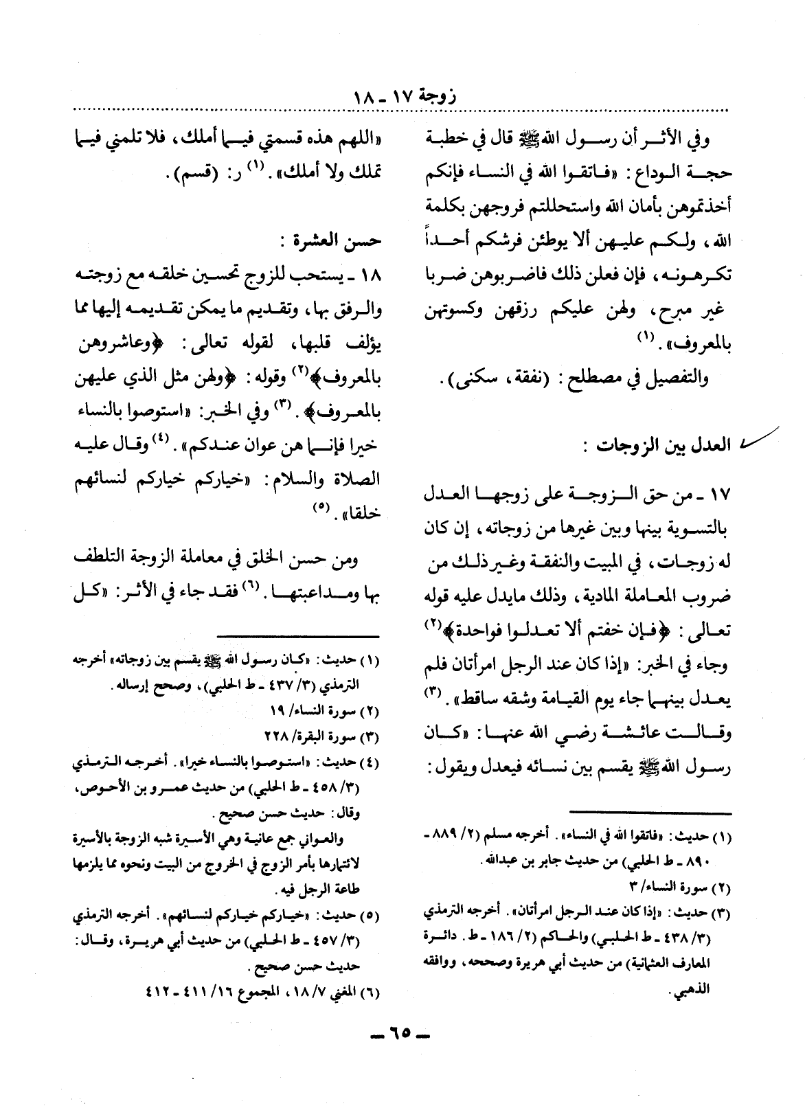 17 - مِنْ حَقِّ الزَّوْجَةِ عَلَى زَوْجِهَا الْعَدْل بِالتَّسْوِيَةِ بَيْنَهَا وَبَيْنَ غَيْرِهَا مِنْ زَوْجَاتِهِ، إِنْ كَانَ لَهُ زَوْجَاتٌ، فِي الْمَبِيتِ وَالنَّفَقَةِ وَغَيْرِ ذَلِكَ مِنْ ضُرُوبِ الْمُعَامَلَةِ الْمَادِّيَّةِ، وَذَلِكَ مَا يَدُل عَلَيْهِ قَوْله تَعَالَى: {فَإِنْ خِفْتُمْ أَلاَّ تَعْدِلُوا فَوَاحِدَةً} (2) وَجَاءَ فِي الْخَبَرِ: إِذَا كَانَ عِنْدَ الرَّجُل امْرَأَتَانِ فَلَمْ يَعْدِل بَيْنَهُمَا جَاءَ يَوْمَ الْقِيَامَةِ وَشِقُّهُ سَاقِطٌ (3) .