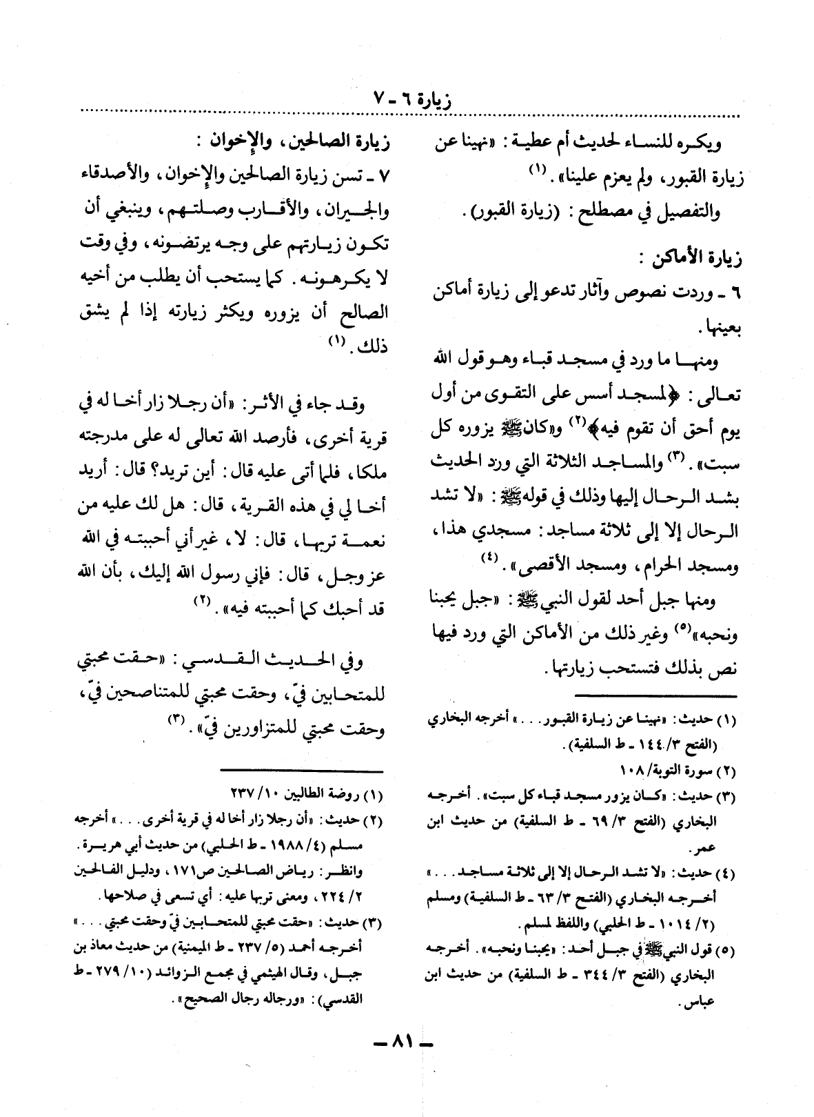 6 - وَرَدَتْ نُصُوصٌ وَآثَارٌ تَدْعُو إِلَى زِيَارَةِ أَمَاكِنَ بِعَيْنِهَا. وَمِنْهَا مَا وَرَدَ فِي مَسْجِدِ قُبَاءٍ وَهُوَ قَوْل اللَّهِ تَعَالَى: {لَمَسْجِدٌ أُسِّسَ عَلَى التَّقْوَى مِنْ أَوَّل يَوْمٍ أَحَقُّ أَنْ تَقُومَ فِيهِ} (2) " وَكَانَ صَلَّى اللَّهُ عَلَيْهِ وَسَلَّمَ يَزُورُهُ كُل سَبْتٍ " (3) . وَالْمَسَاجِدُ الثَّلاَثَةُ الَّتِي وَرَدَ الْحَدِيثُ بِشَدِّ الرِّحَال إِلَيْهَا وَذَلِكَ فِي قَوْلِهِ صَلَّى اللَّهُ عَلَيْهِ وَسَلَّمَ: لاَ تُشَدُّ الرِّحَال إِلاَّ إِلَى ثَلاَثَةِ مَسَاجِدَ: مَسْجِدِي هَذَا، وَمَسْجِدِ الْحَرَامِ، وَمَسْجِدِ الأَْقْصَى (4) .