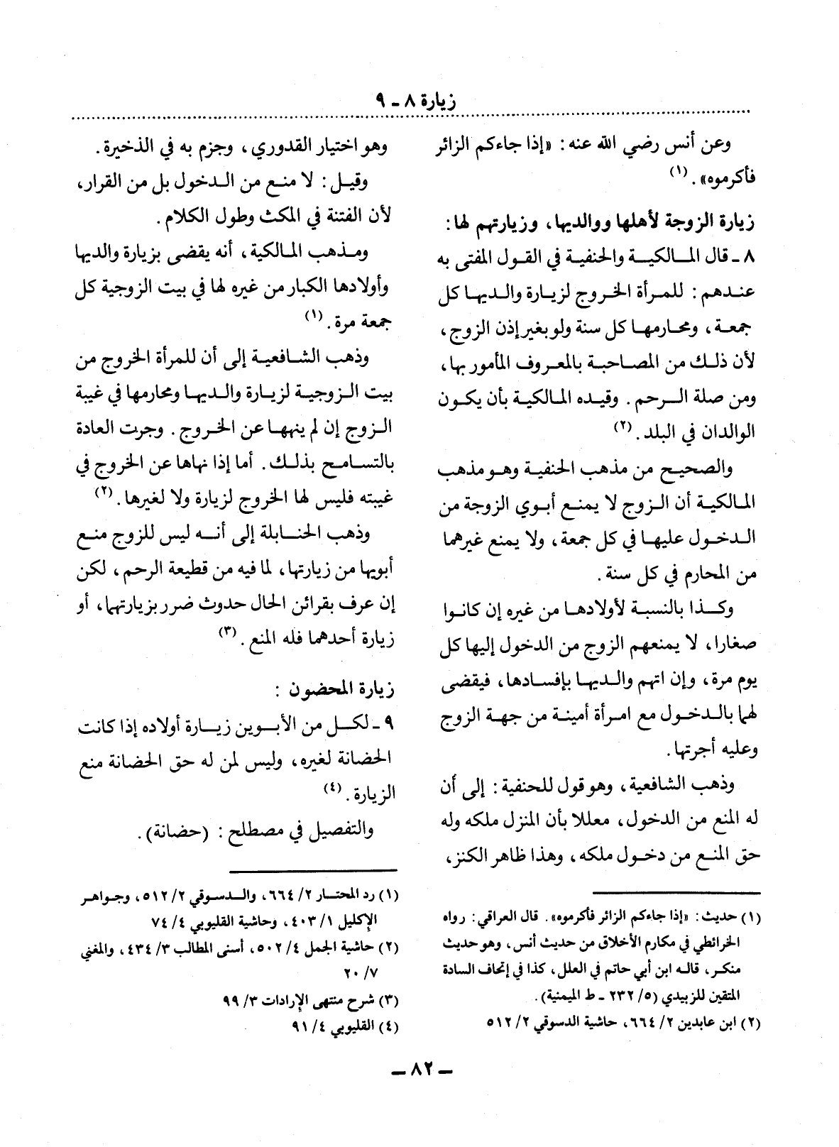 9 - لِكُلٍّ مِنَ الأَْبَوَيْنِ زِيَارَةُ أَوْلاَدِهِ إِذَا كَانَتِ الْحَضَانَةُ لِغَيْرِهِ، وَلَيْسَ لِمَنْ لَهُ حَقُّ الْحَضَانَةِ مَنْعُ الزِّيَارَةِ (4) . وَالتَّفْصِيل فِي مُصْطَلَحِ: (حَضَانَةٍ) .