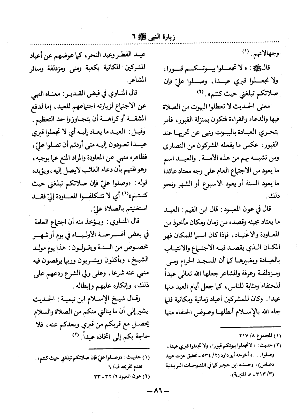 قَال صَلَّى اللَّهُ عَلَيْهِ وَسَلَّمَ: لاَ تَجْعَلُوا بُيُوتَكُمْ قُبُورًا، وَلاَ تَجْعَلُوا قَبْرِي عِيدًا، وَصَلُّوا عَلَيَّ فَإِنَّ صَلاَتَكُمْ تَبْلُغُنِي حَيْثُ كُنْتُمْ. (2)